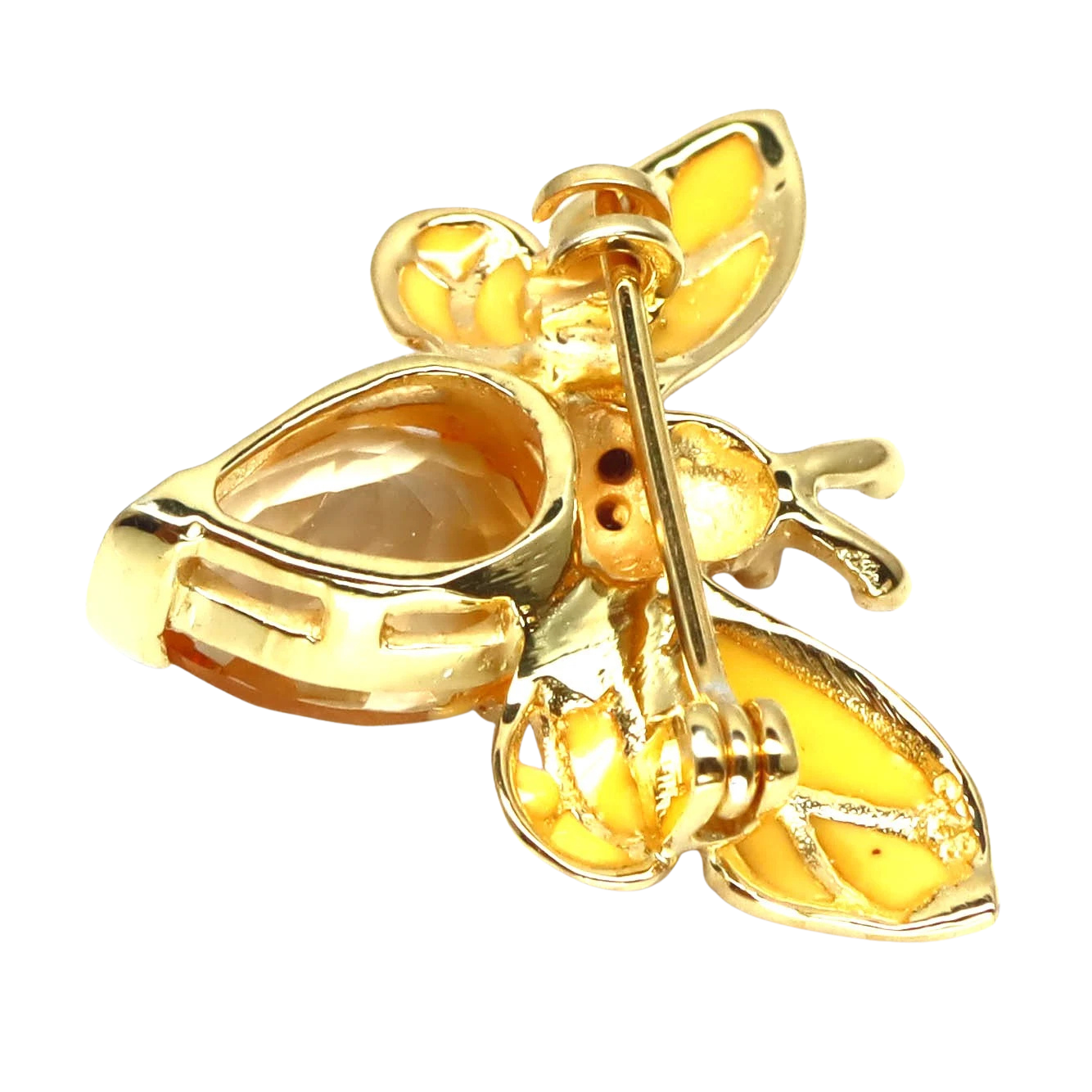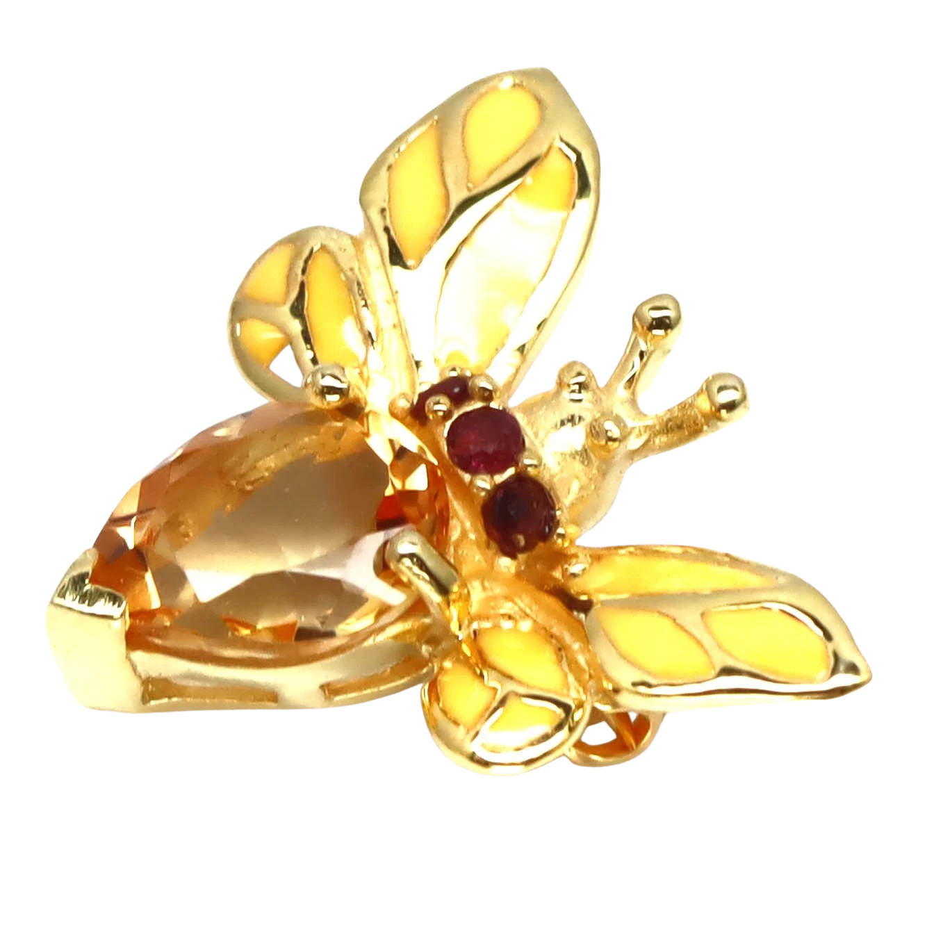 Bijuterii argint,: Brosa, argint 925, aurit cu aur galben de 14k cu pietre naturale: citrin si granat; email.