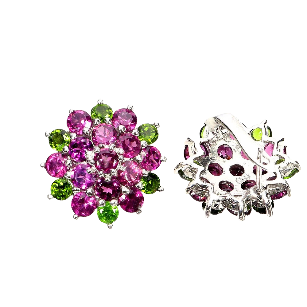 Bijuterii argint,: Cercei argint, 925, aurit cu aur alb de 14k, cu pietre naturale: granat rodolit si crom-diopsid.