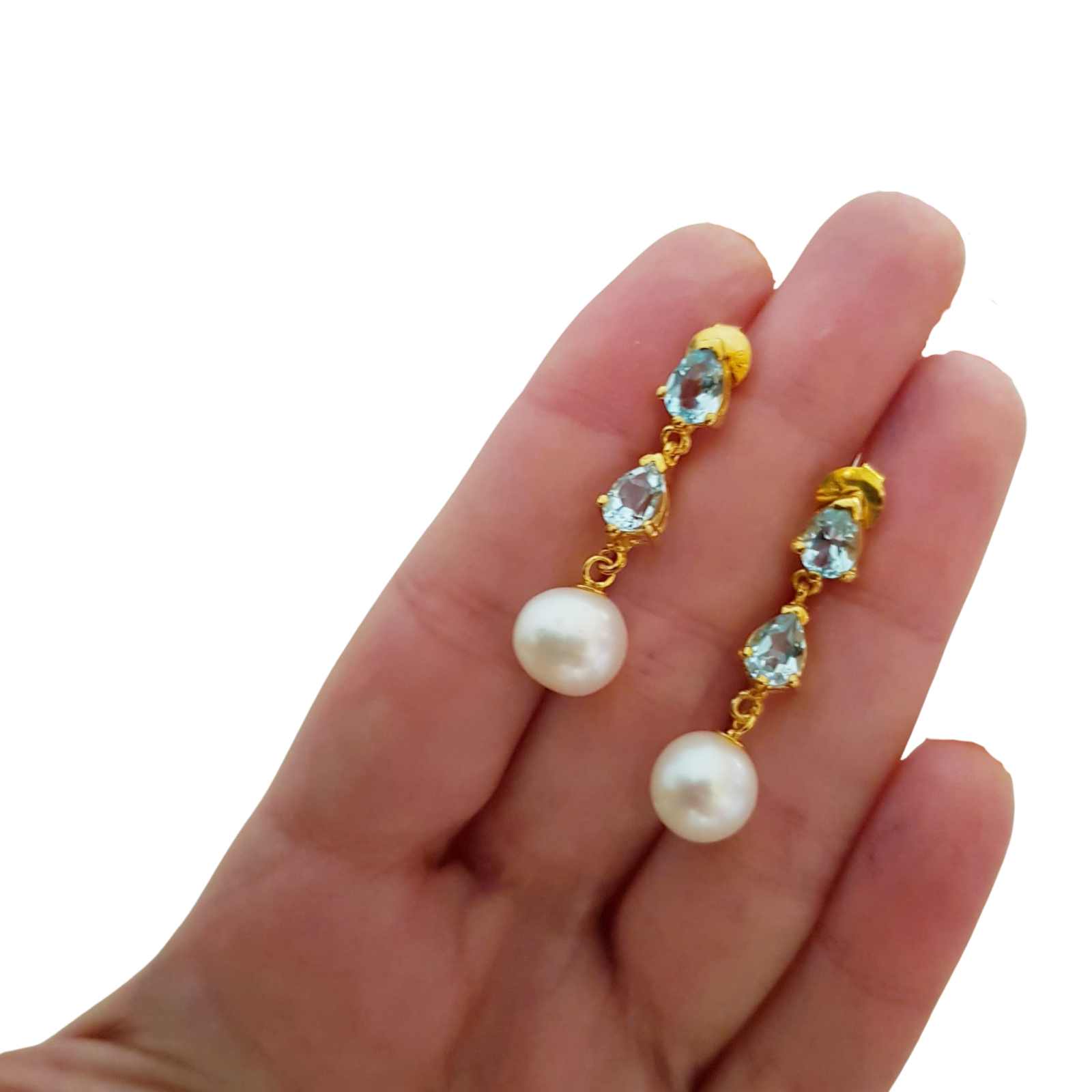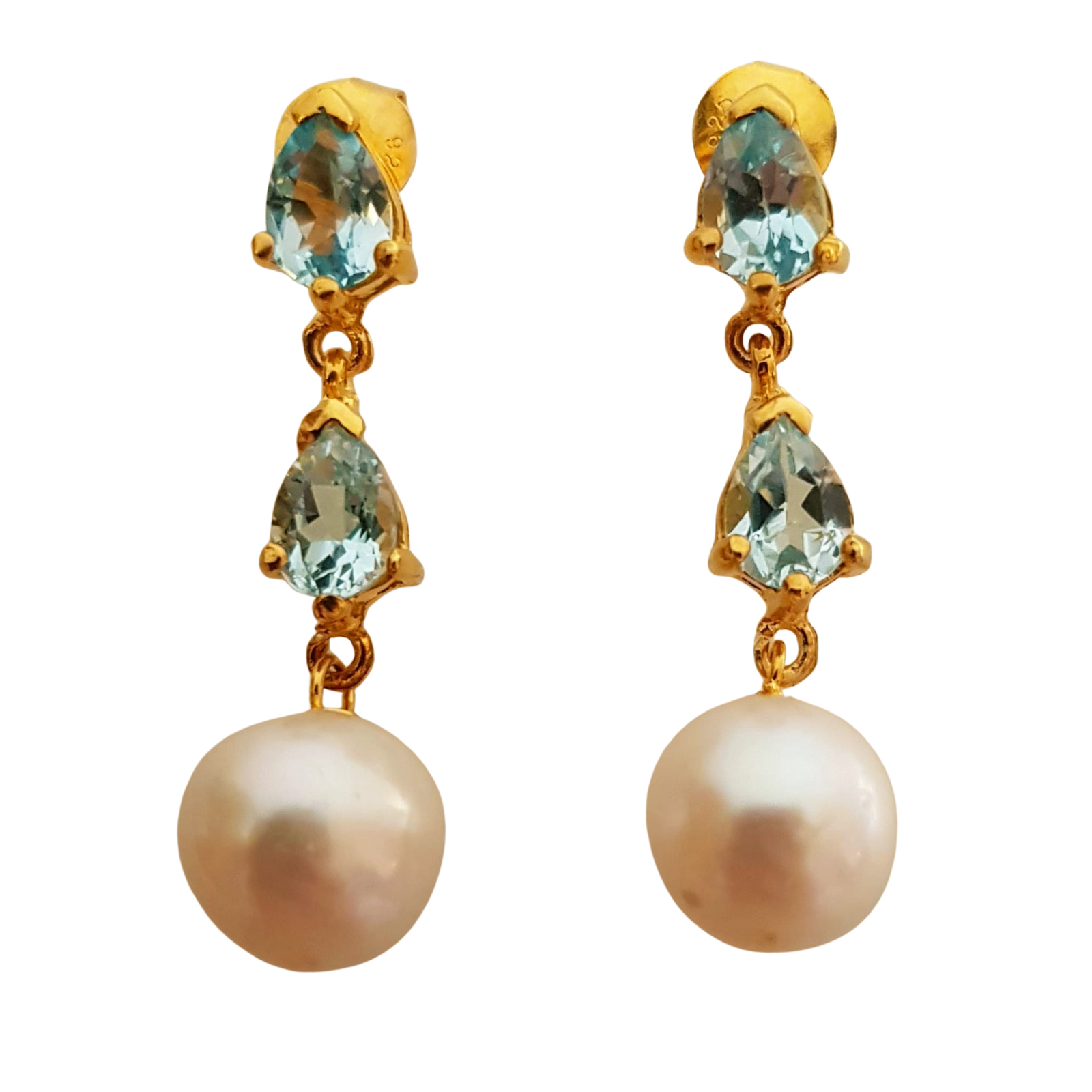 Bijuterii argint,: Cercei argint, 925, aurit cu aur galben de 14k, cu pietre naturale: perle naturale de cultura si topaz.