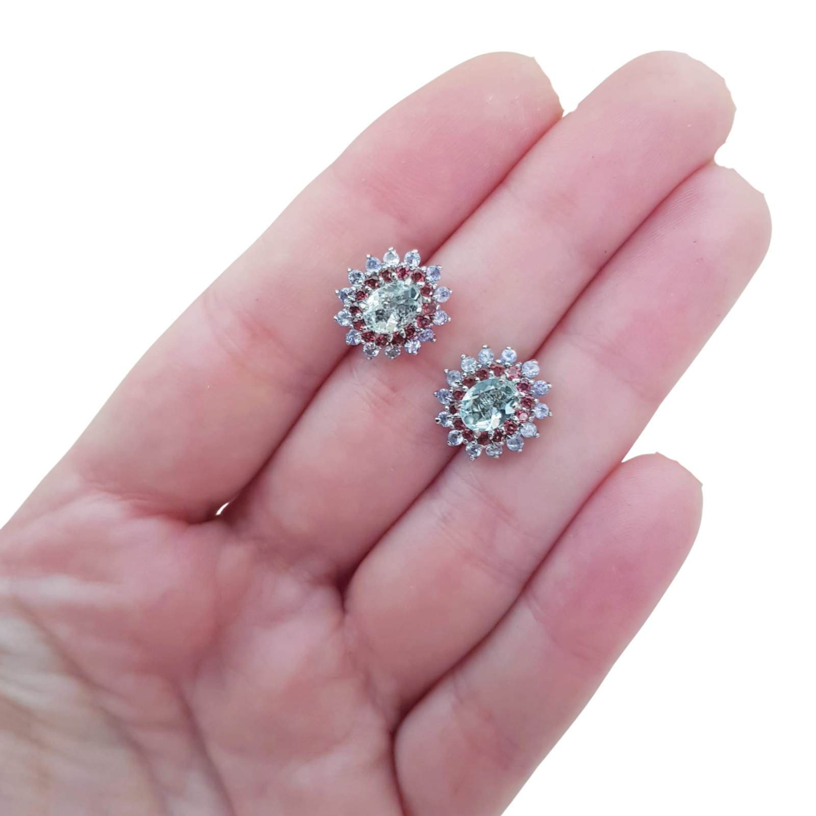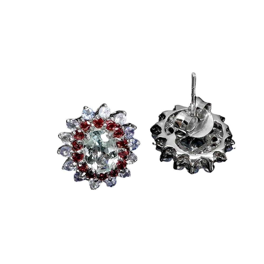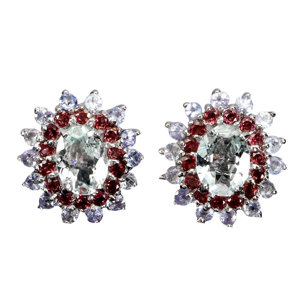 Bijuterii argint,: Cercei argint, 925, aurit cu aur alb de 14k, cu pietre naturale: acvamarin, tanzanit si granat.