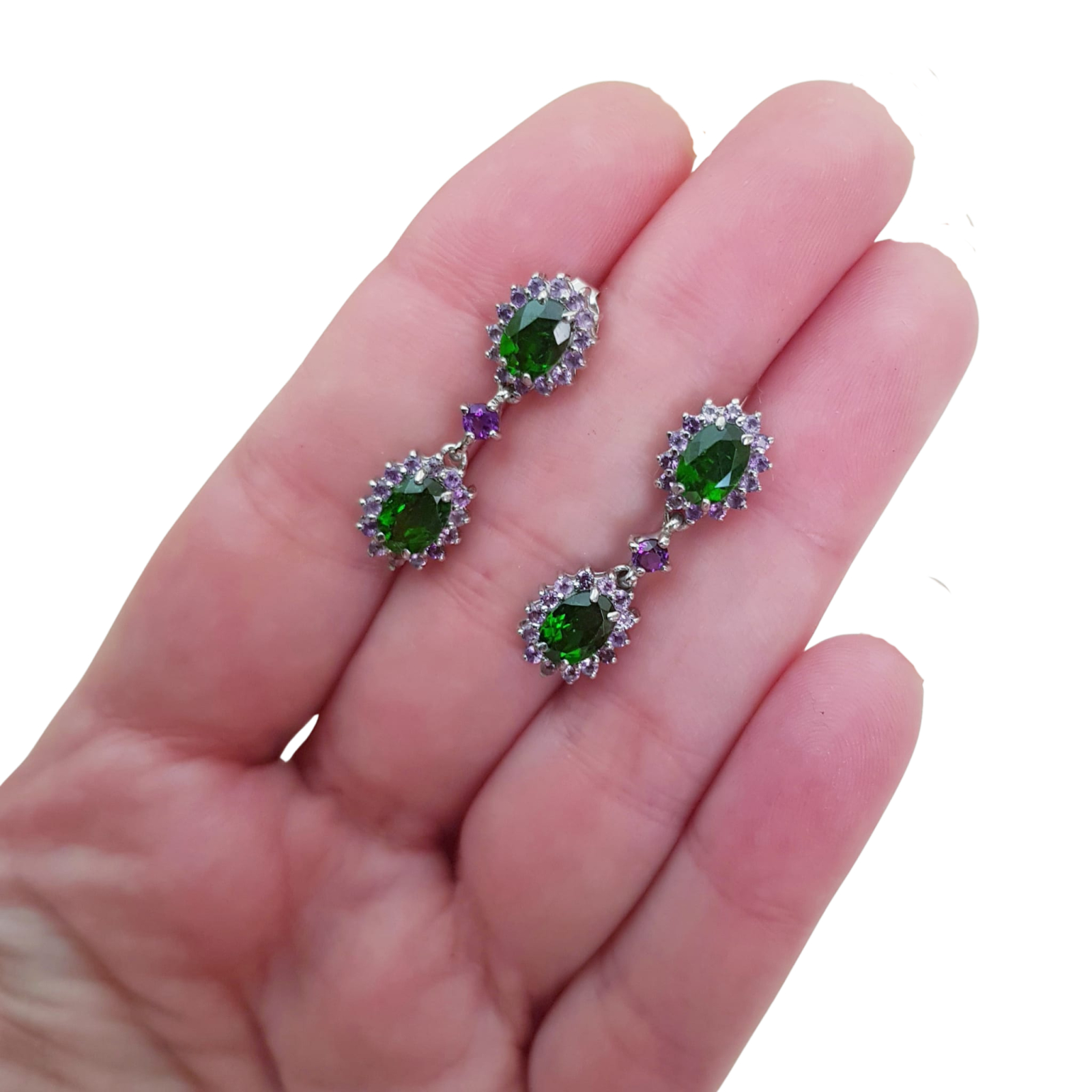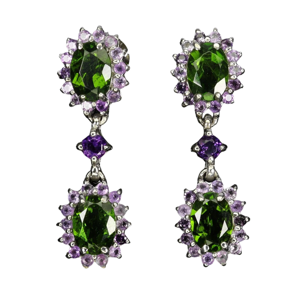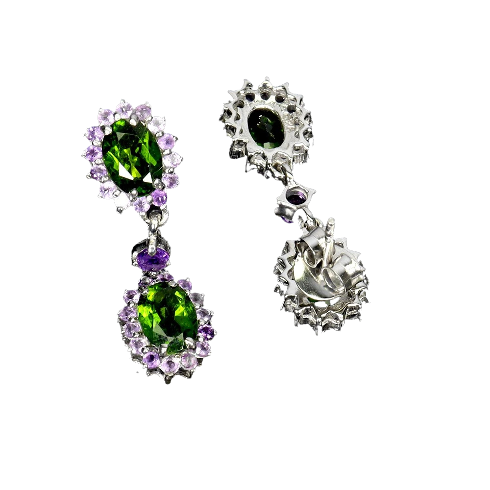 Bijuterii argint,: Cercei argint, 925, aurit cu aur alb de 14k, cu pietre naturale: crom-diopsid si ametist.