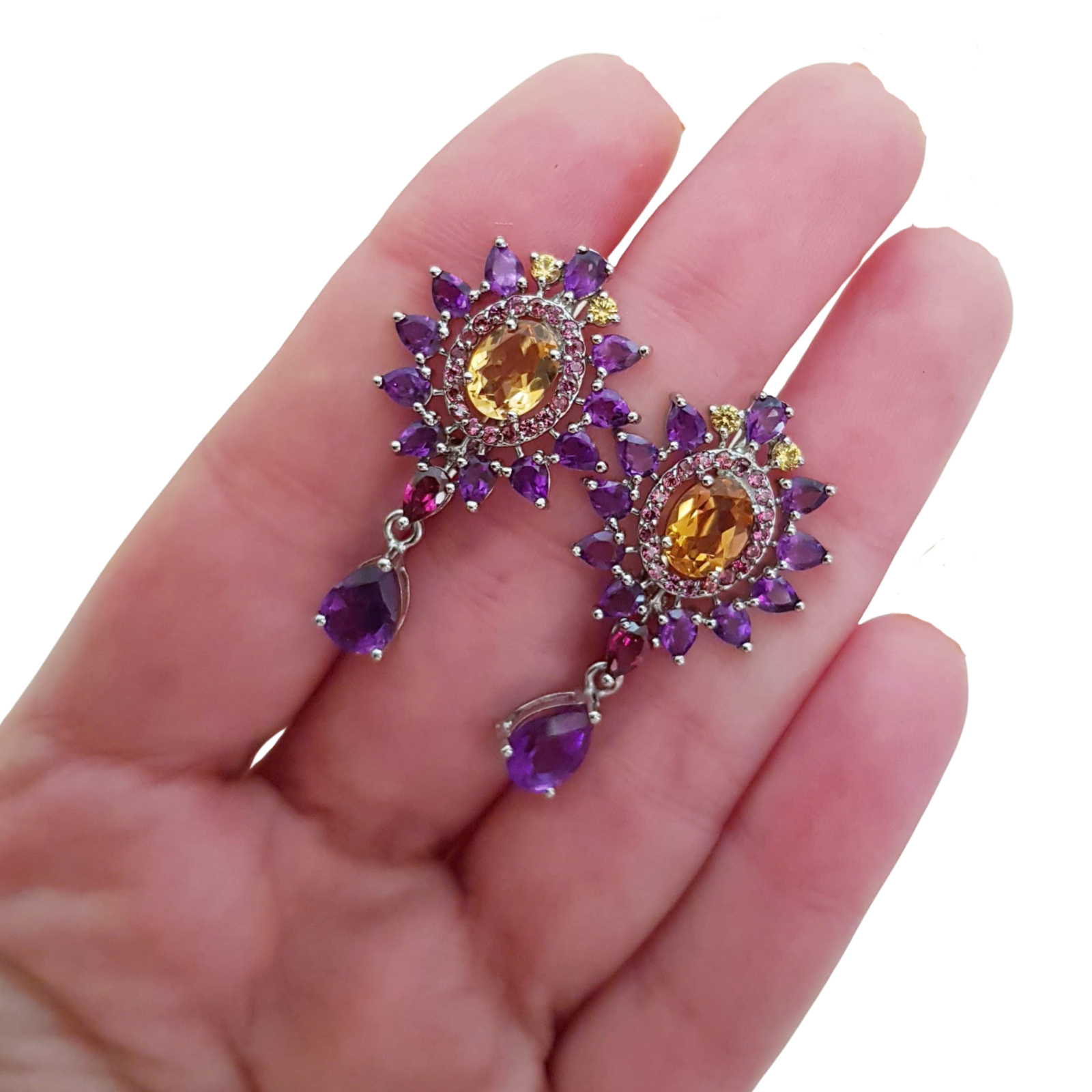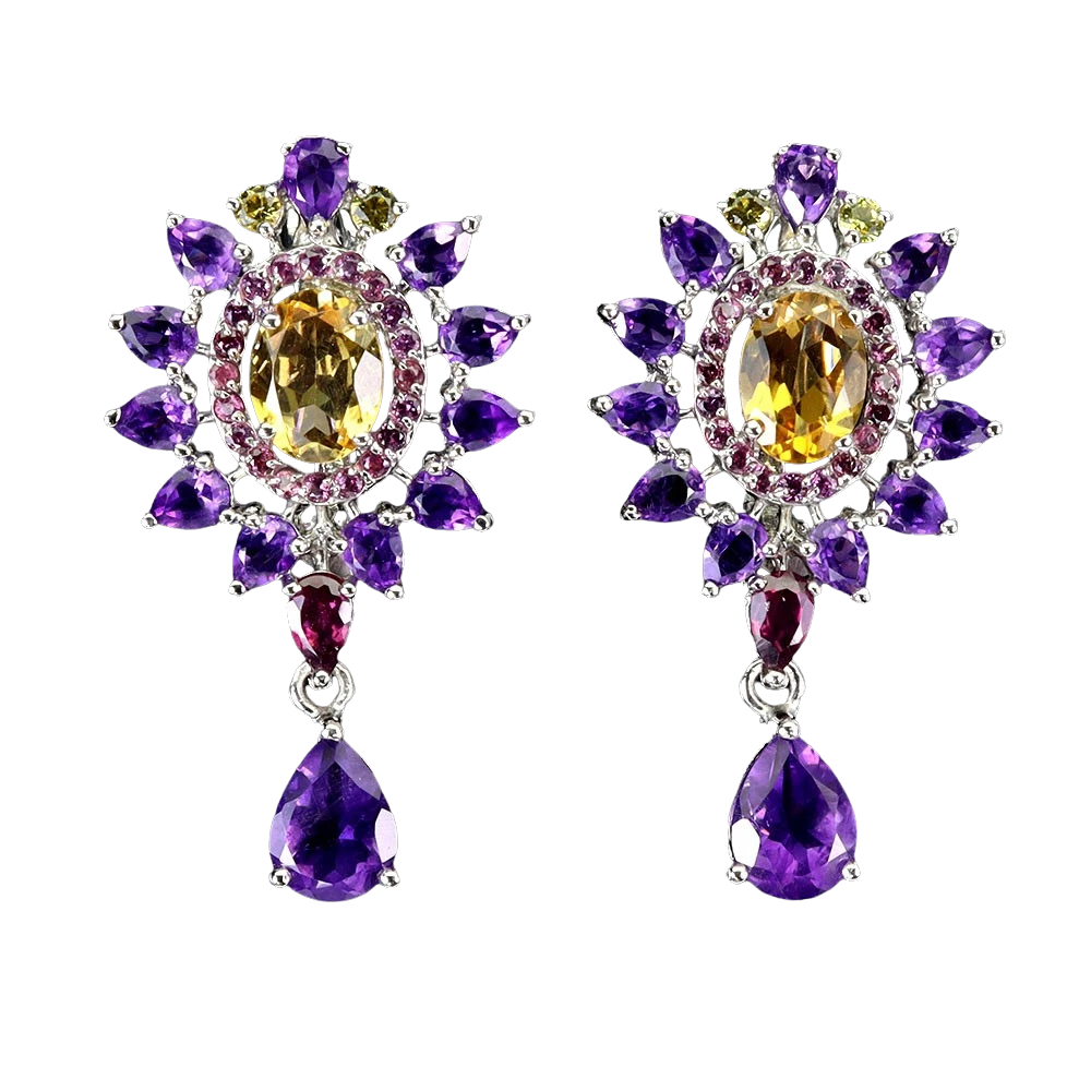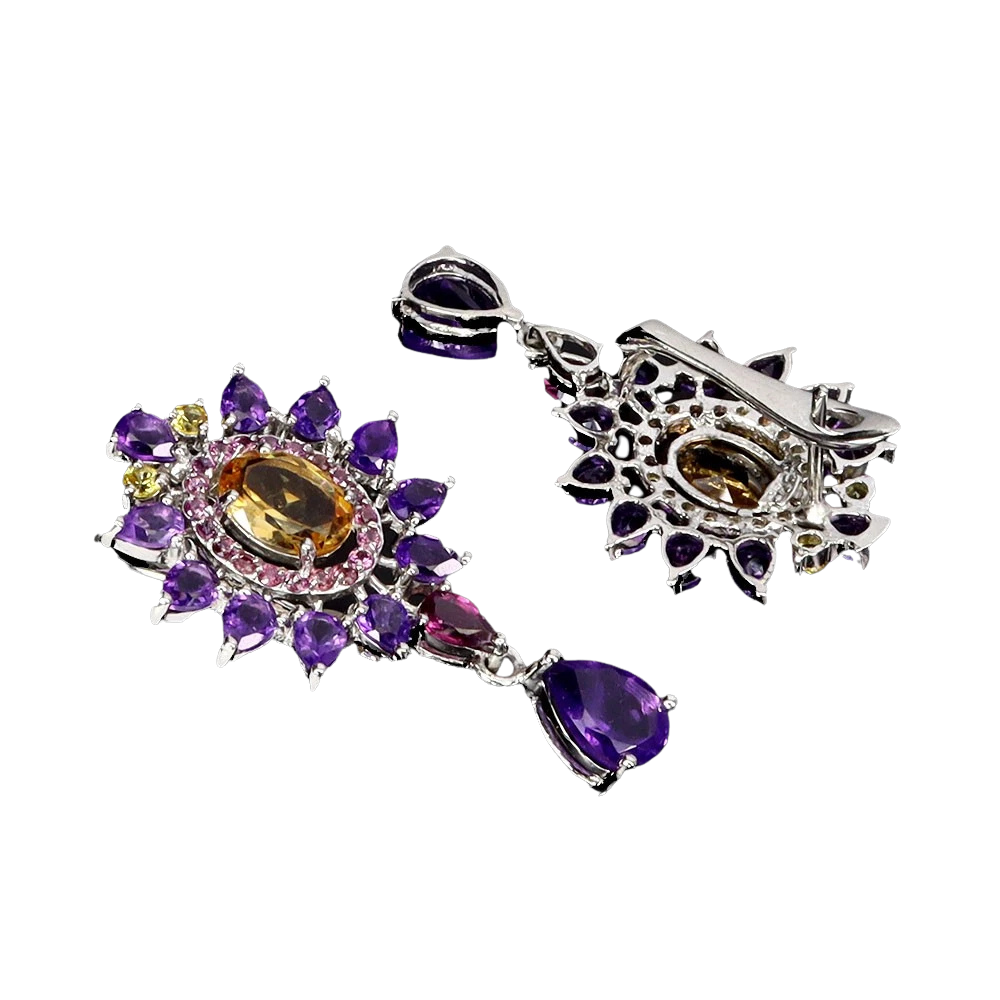 Bijuterii argint,: Cercei argint, 925, aurit cu aur alb de 14k, cu pietre naturale: ametist, citrin si safir roz.