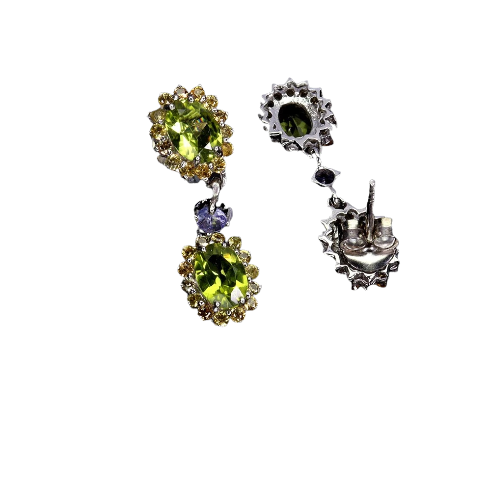 Bijuterii argint,: Cercei argint, 925, aurit cu aur alb de 14k, cu pietre naturale: pridot, safir galben si tanzanit.