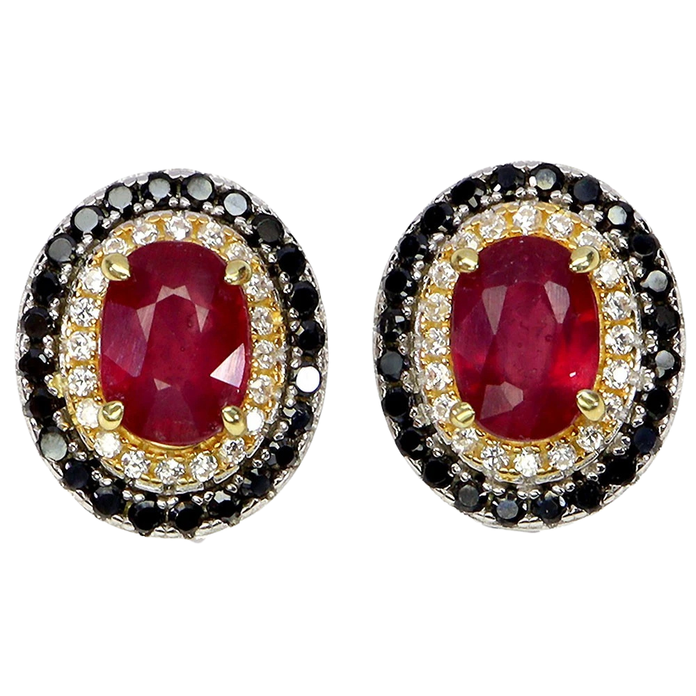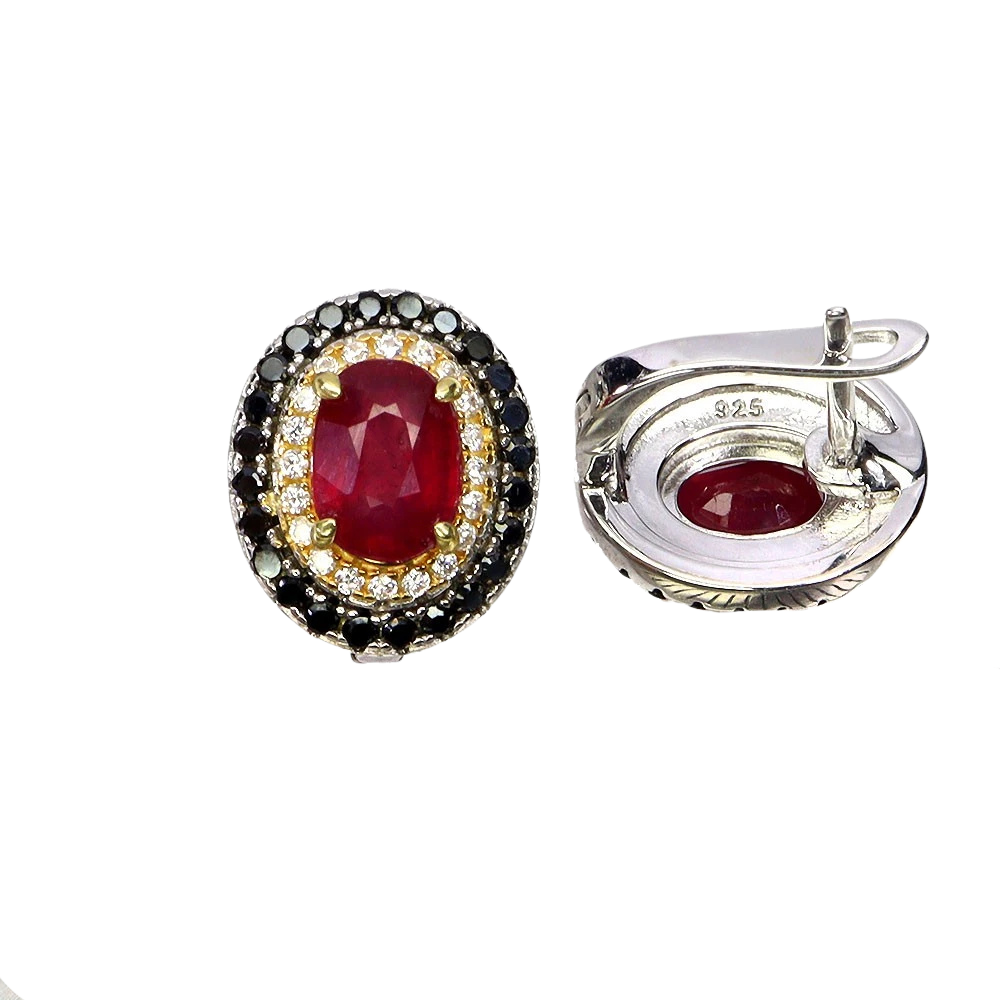 Bijuterii argint,: Cercei argint, 925, aurit in doua tonuri cu aur alb si galben de 14k, cu pietre naturale: rubin si spinel; cz.