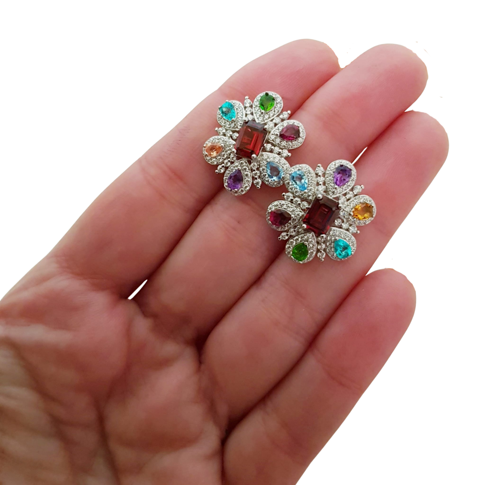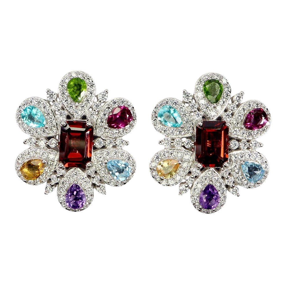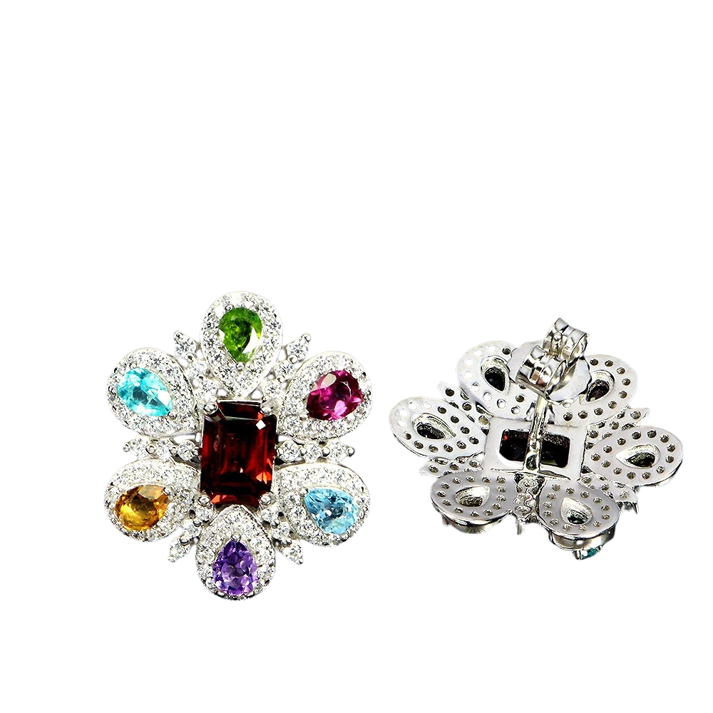 Bijuterii argint,: Cercei argint, 925, aurit cu aur alb de 14k, cu pietre naturale: granat, topaz, crom-diopsid, ametist, apatit si citrin; cz.