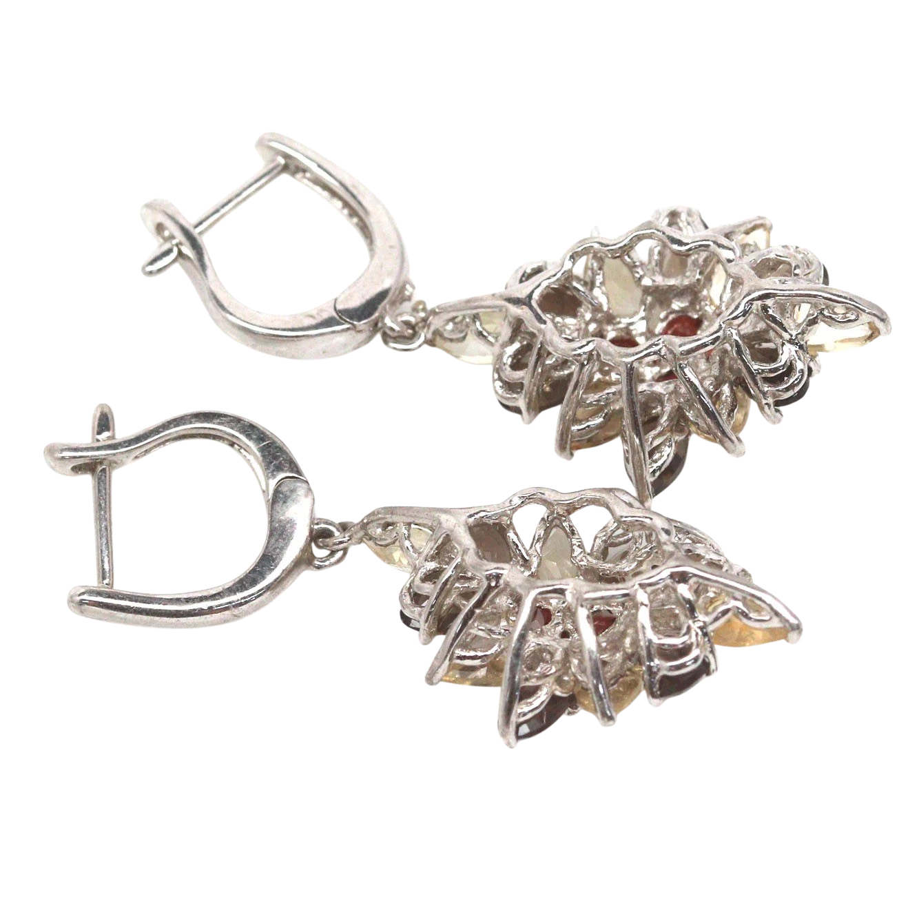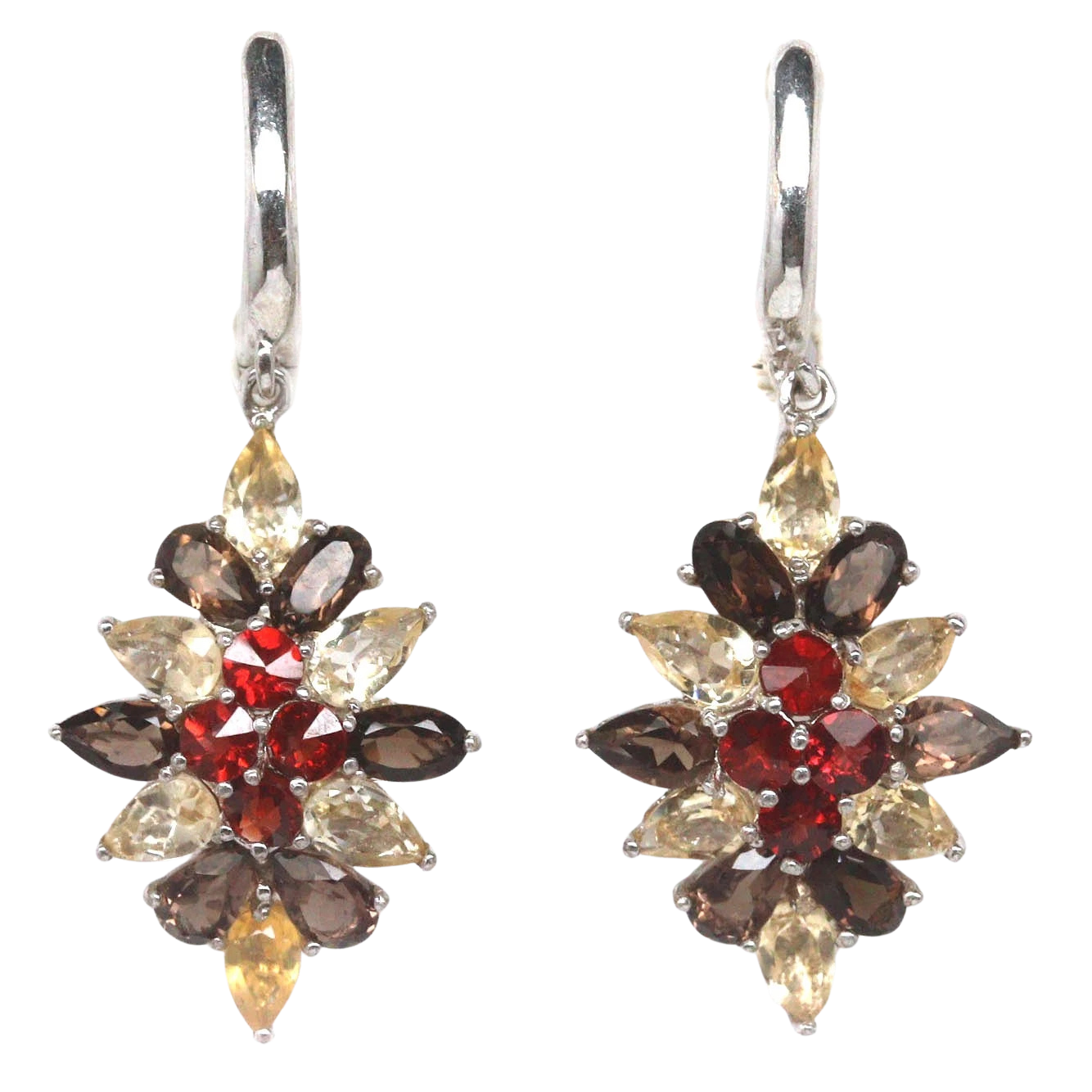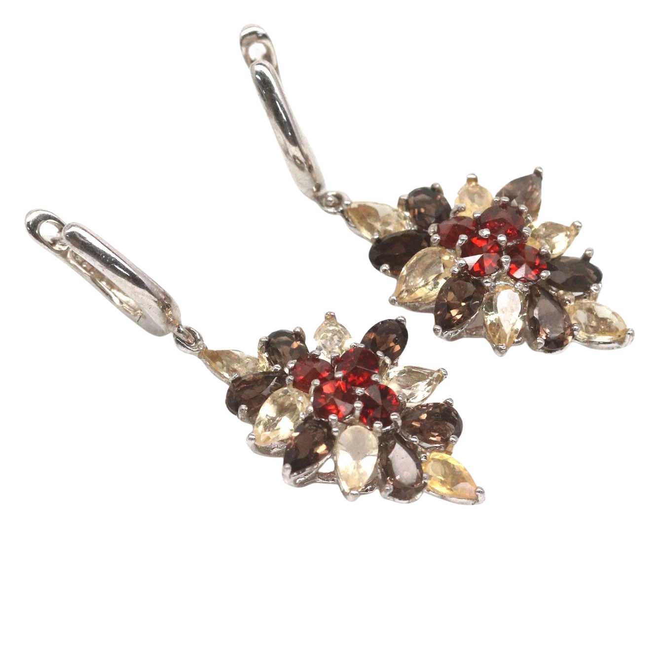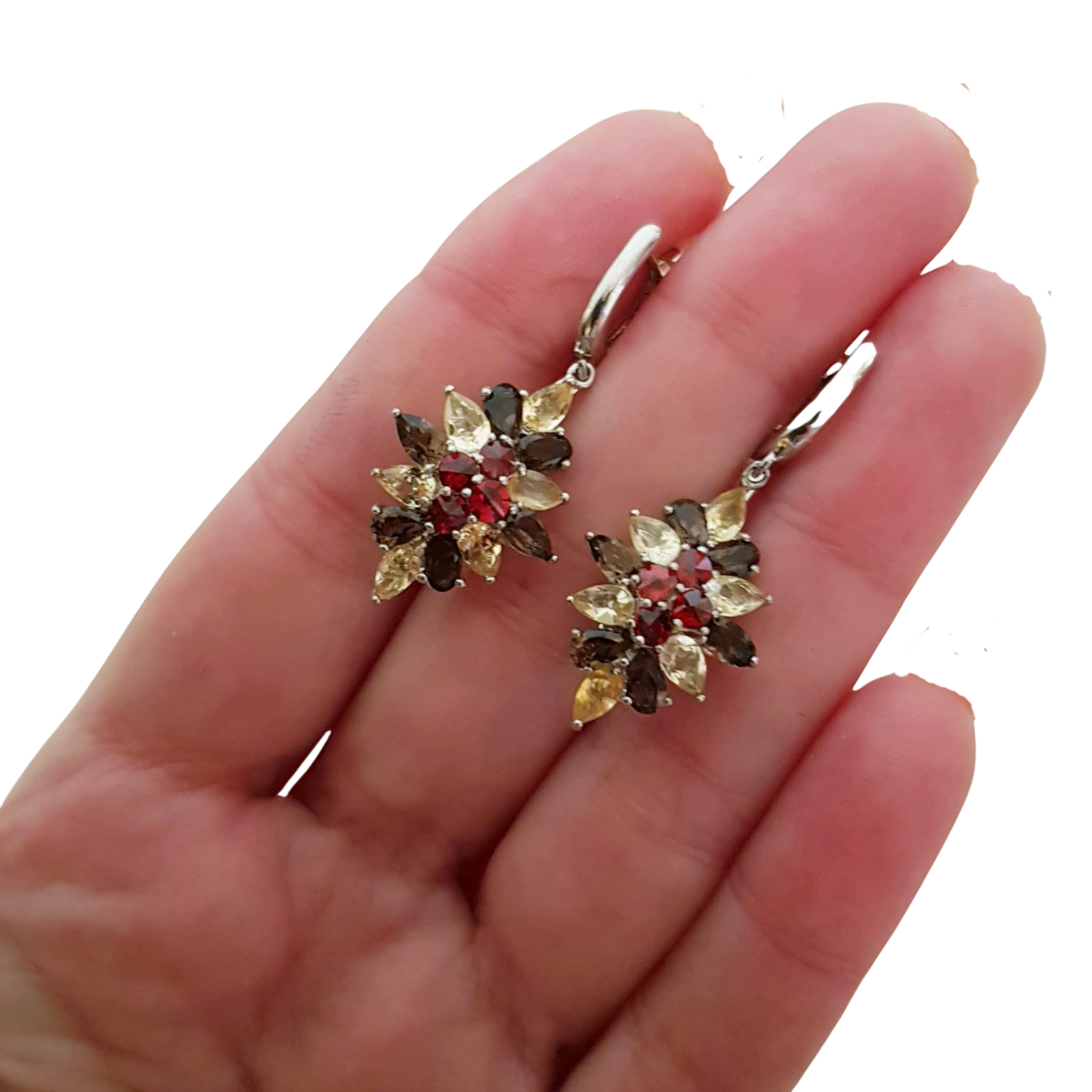 Bijuterii argint,: Cercei argint, 925, aurit cu aur alb de 14k, cu pietre naturale: cuart fumuriu, granat si citrin. Pietrele de citrin au nuante usor diferite.