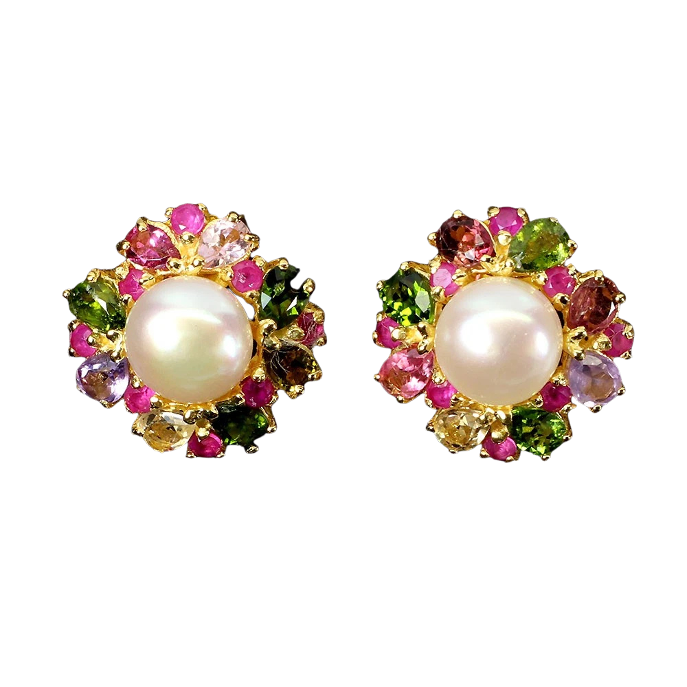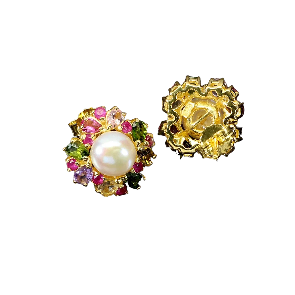 Bijuterii argint,: Cercei argint, 925, aurit cu aur galben de 14k, cu pietre naturale: rubin, turmalina si perle.