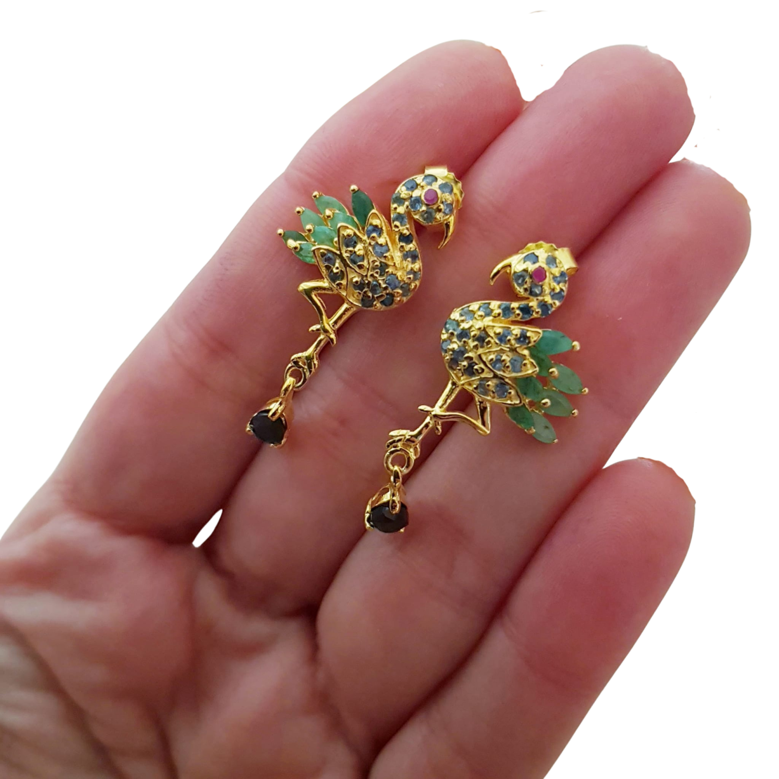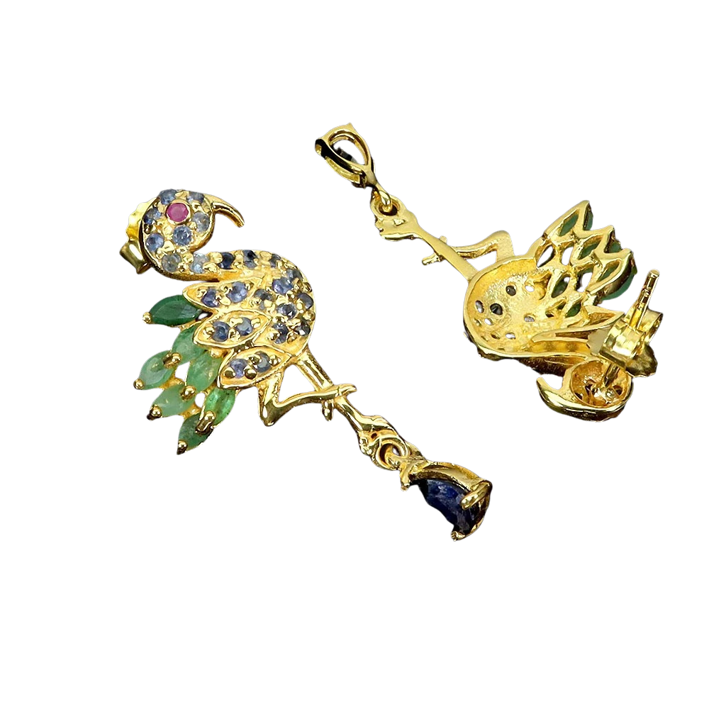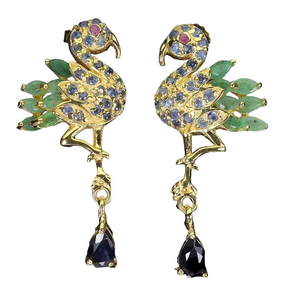 Bijuterii argint,: Cercei argint, 925, aurit cu aur galben de 14k, cu pietre naturale: smarald, safir si rubin.