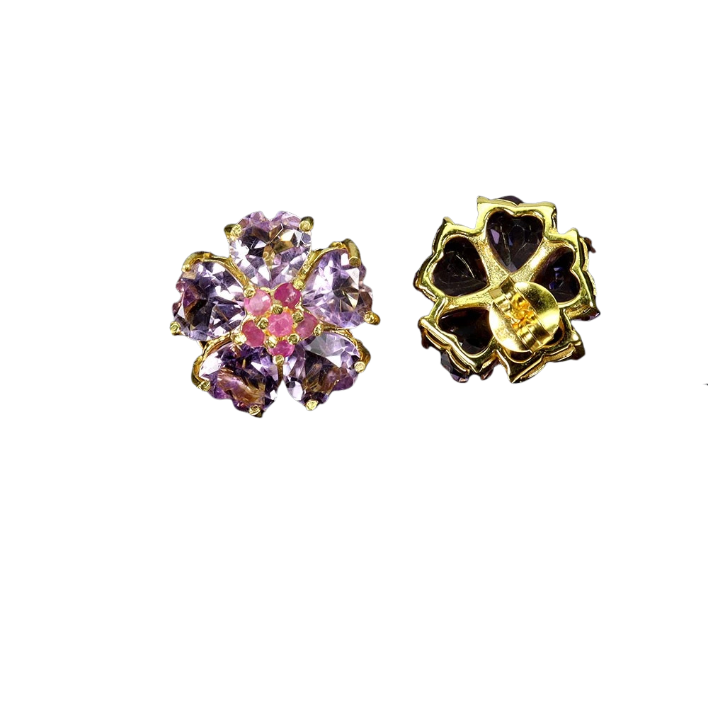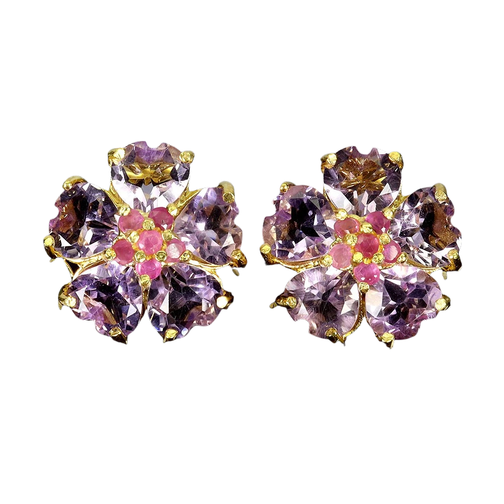 Bijuterii argint,: Cercei argint, 925, aurit cu aur galben de 14k, cu pietre naturale: ametist si rubin.