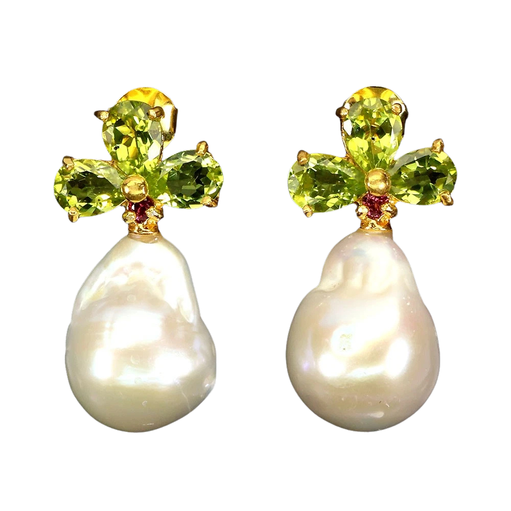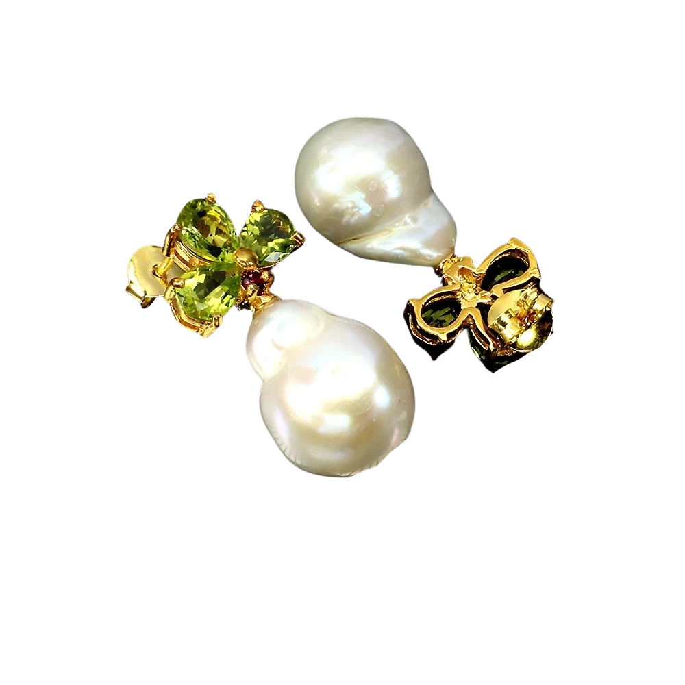 Bijuterii argint,: Cercei argint, 925, aurit cu aur galben de 14k, cu pietre naturale: peridot, granat si perla baroca. Perlele prezinta usoare imperfectiuni.