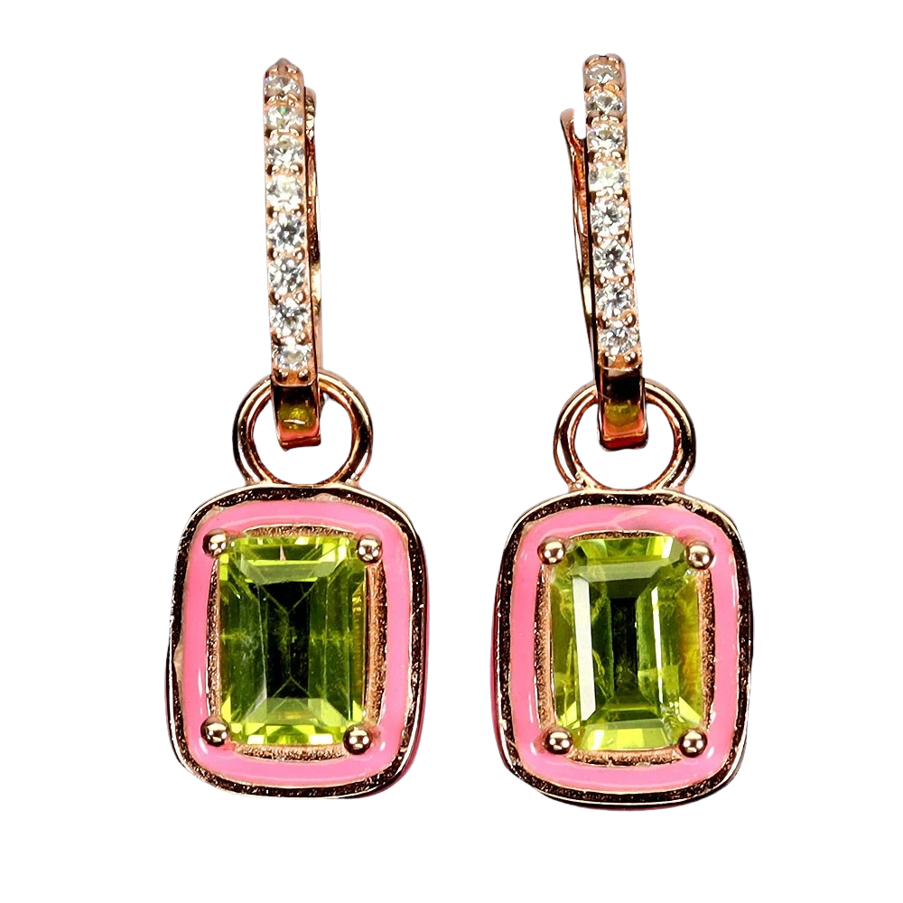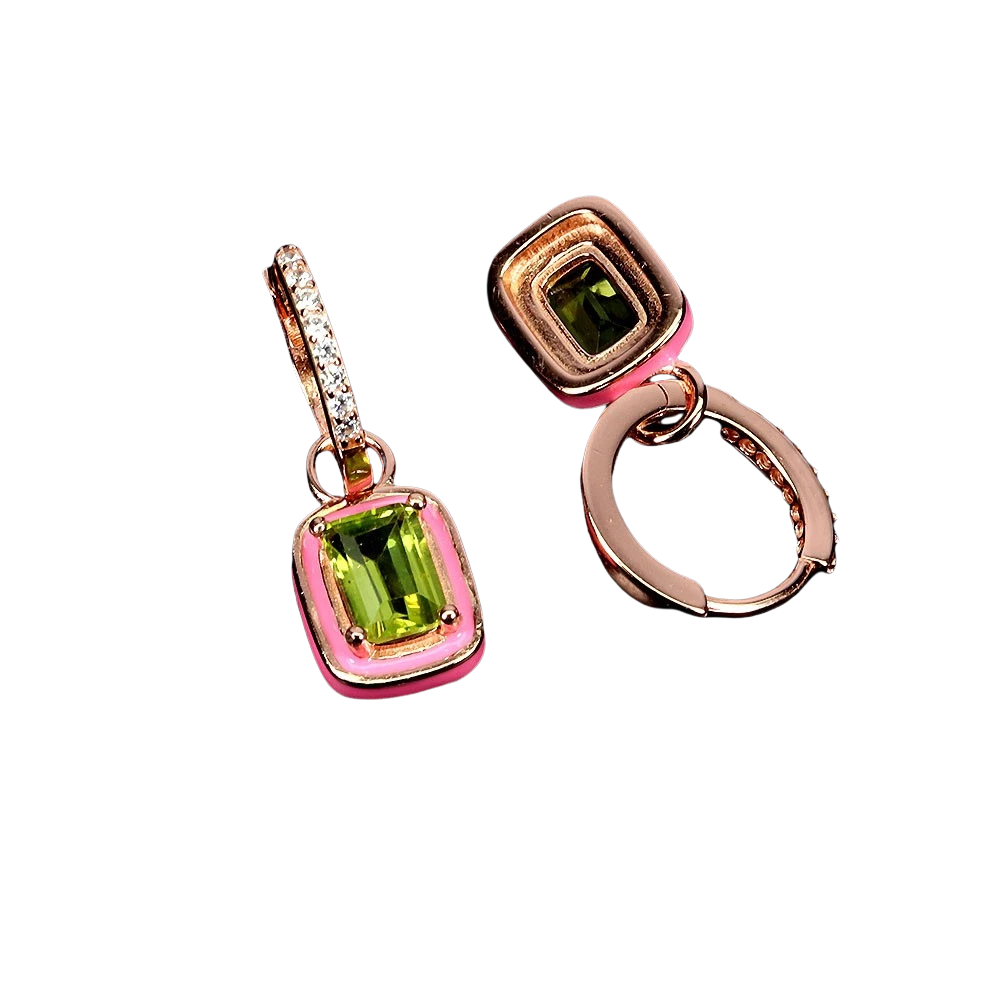 Bijuterii argint,: Cercei argint, 925, aurit cu aur roz de 14k, cu pietre naturale: peridot; cz. si email. Cercei modulari.