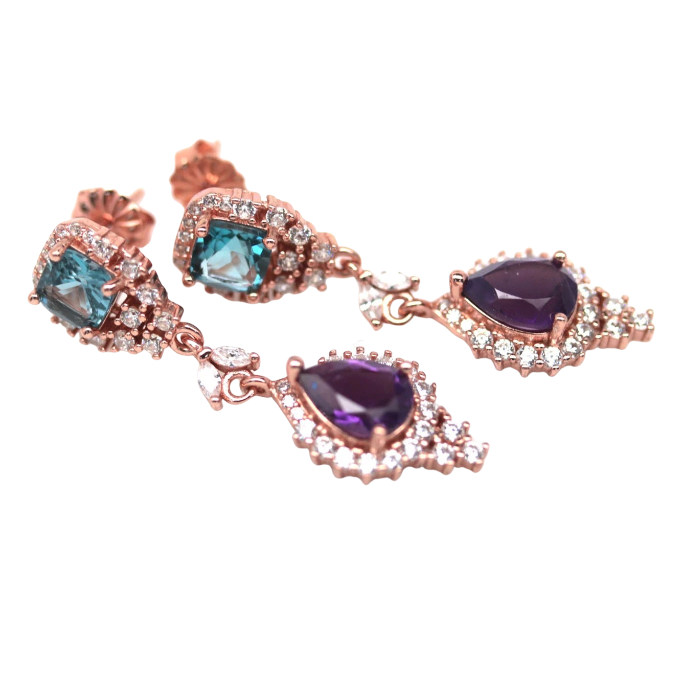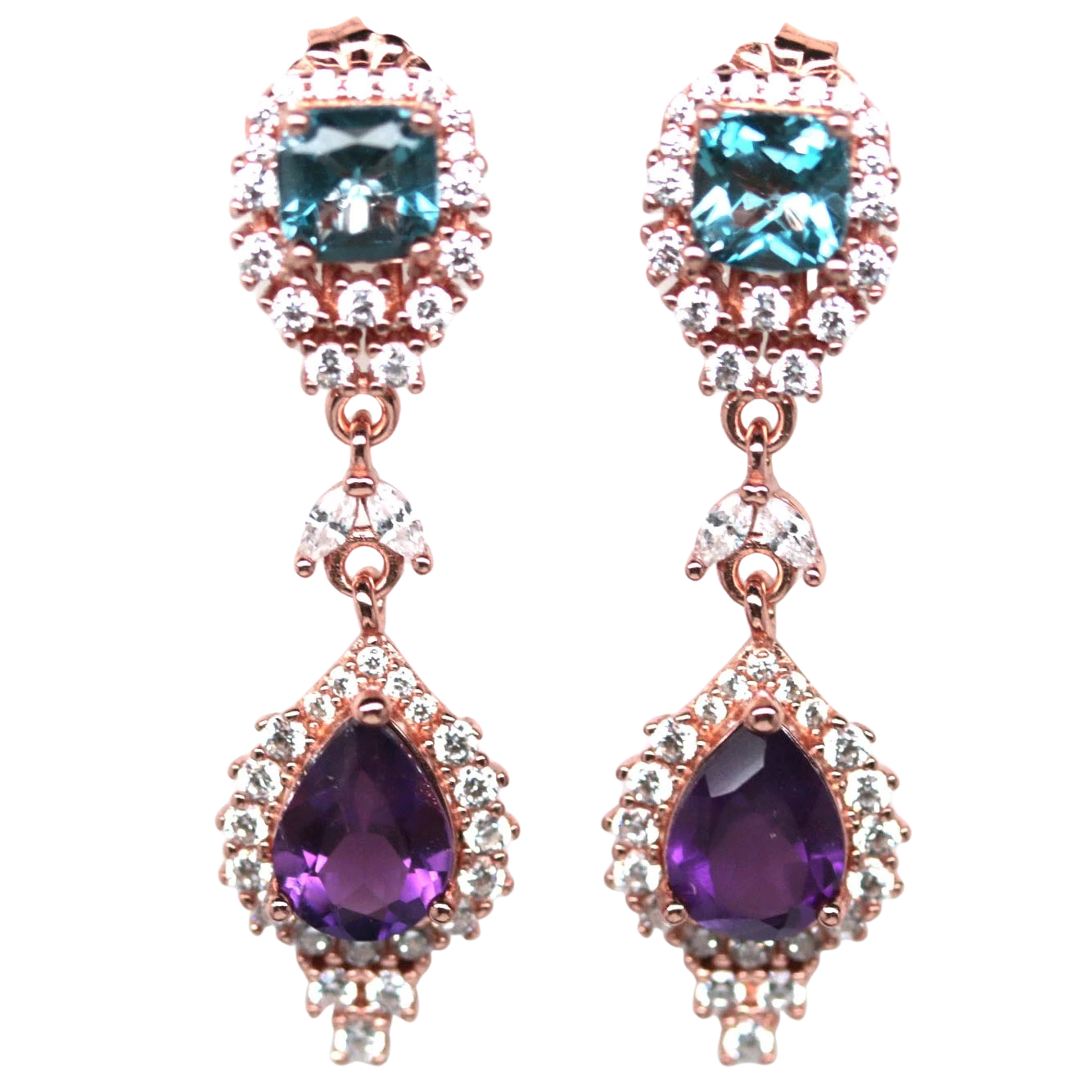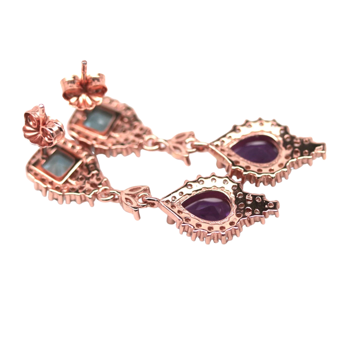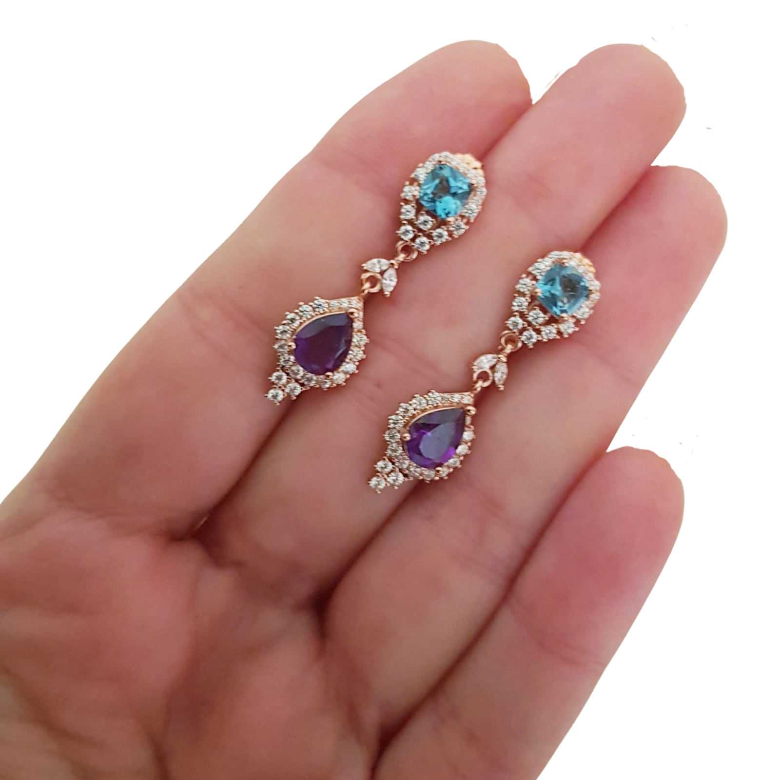 Bijuterii argint,: Cercei argint, 925, aurit cu aur roz de 14k, cu pietre naturale: topaz london si ametist; cz.