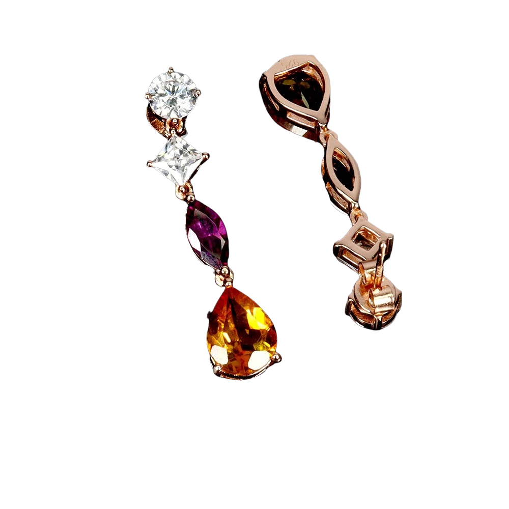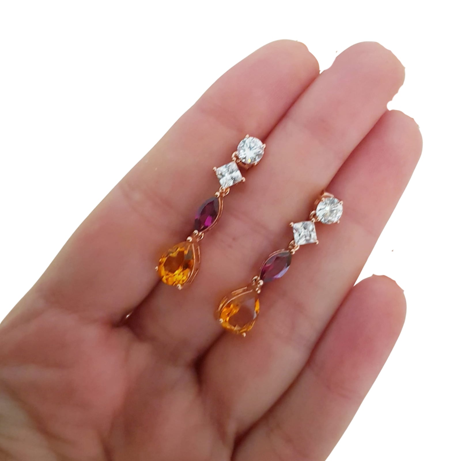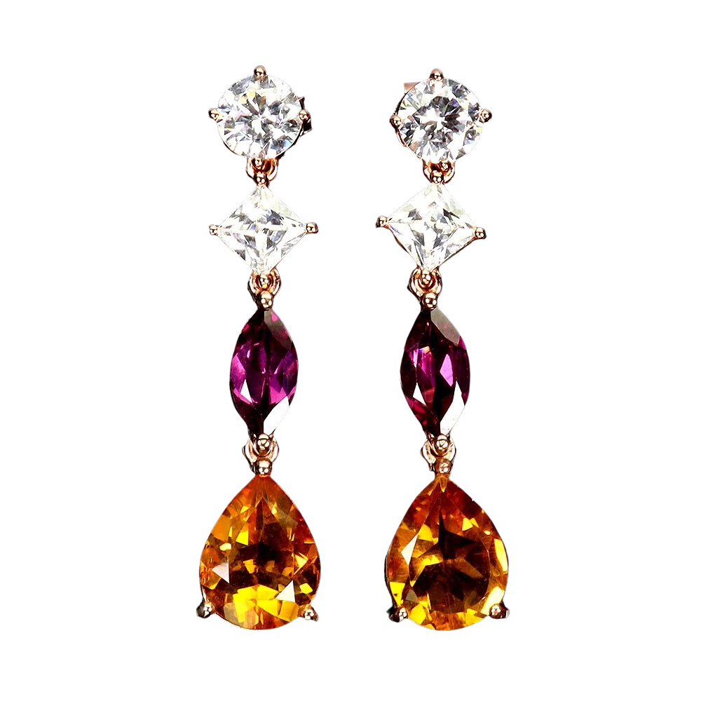 Bijuterii argint,: Cercei argint, 925, aurit cu aur roz de 14k, cu pietre naturale: citrin si granat; cz.
