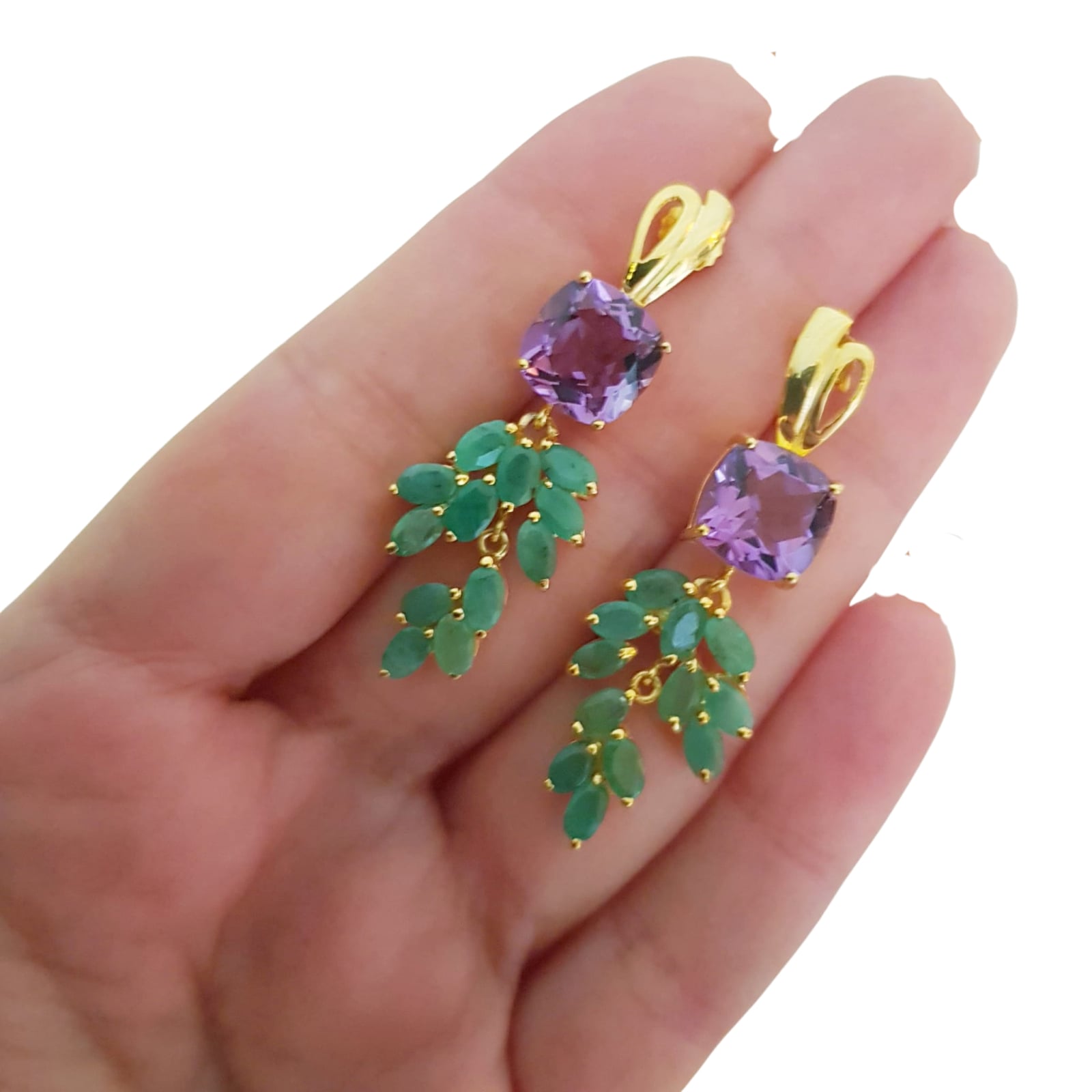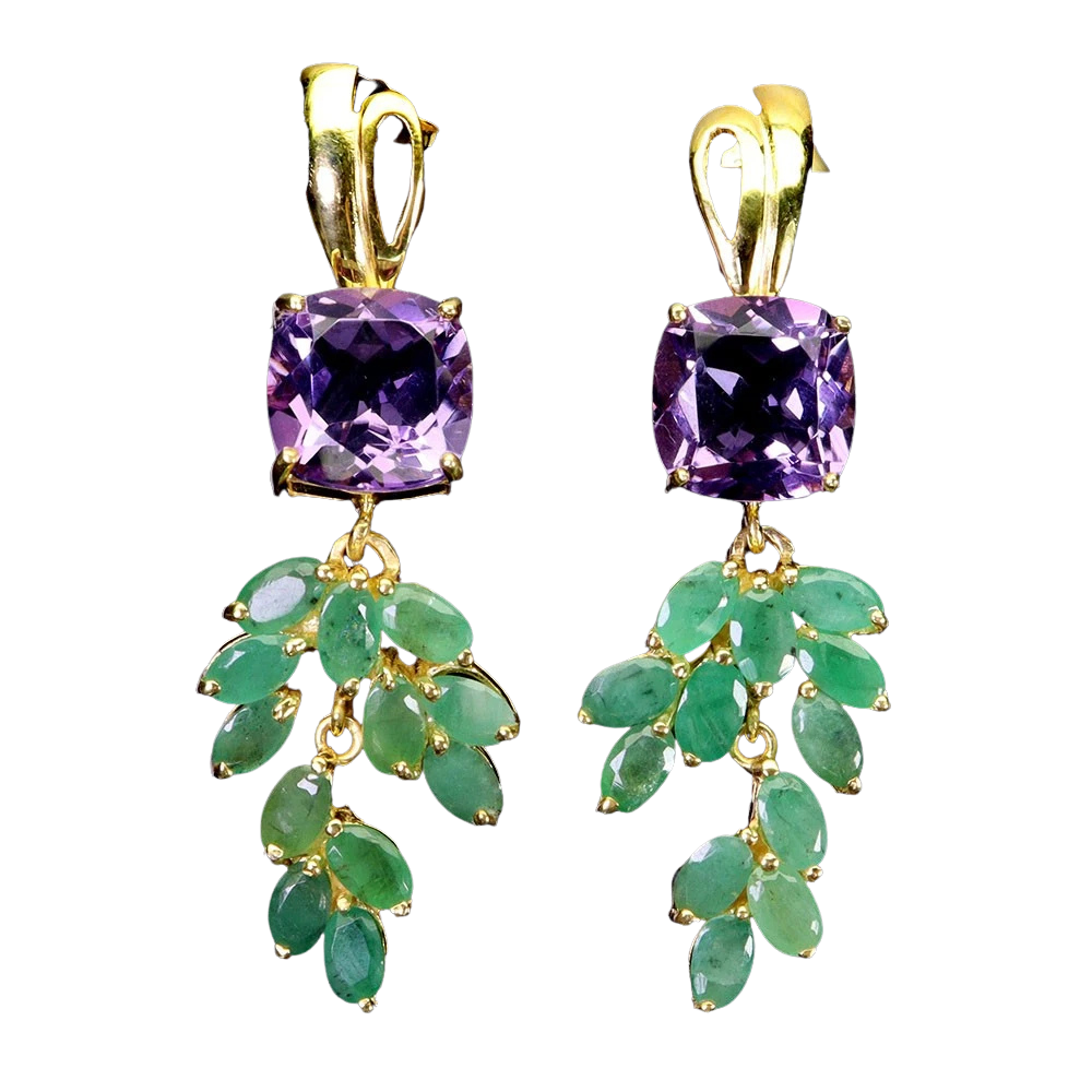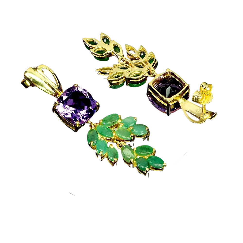 Bijuterii argint,: Cercei argint, 925, aurit cu aur galben de 14k, cu pietre naturale: smarald si ametist.
