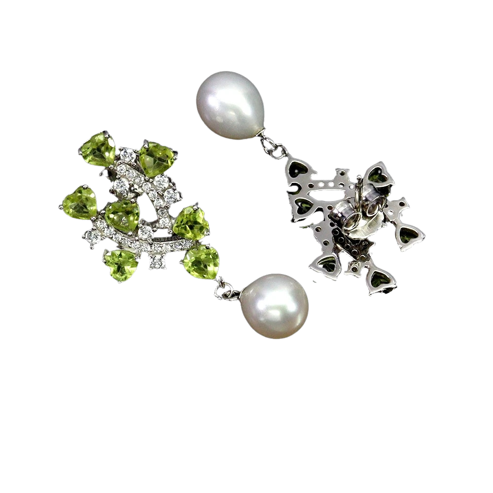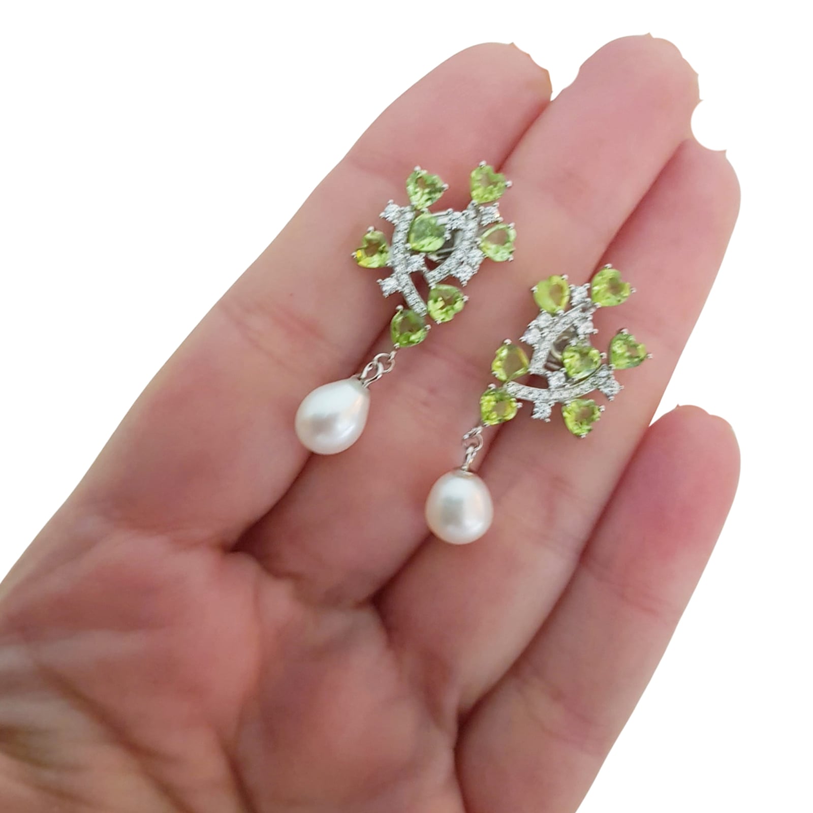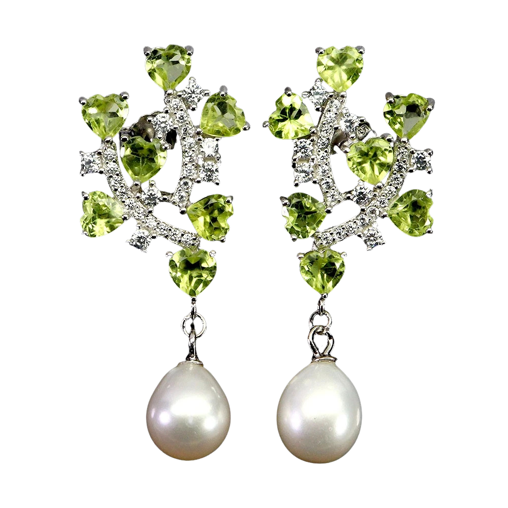 Bijuterii argint,: Cercei argint, 925, aurit cu aur alb de 14k, cu pietre naturale: peridot si perle naturale de cultura; cz.