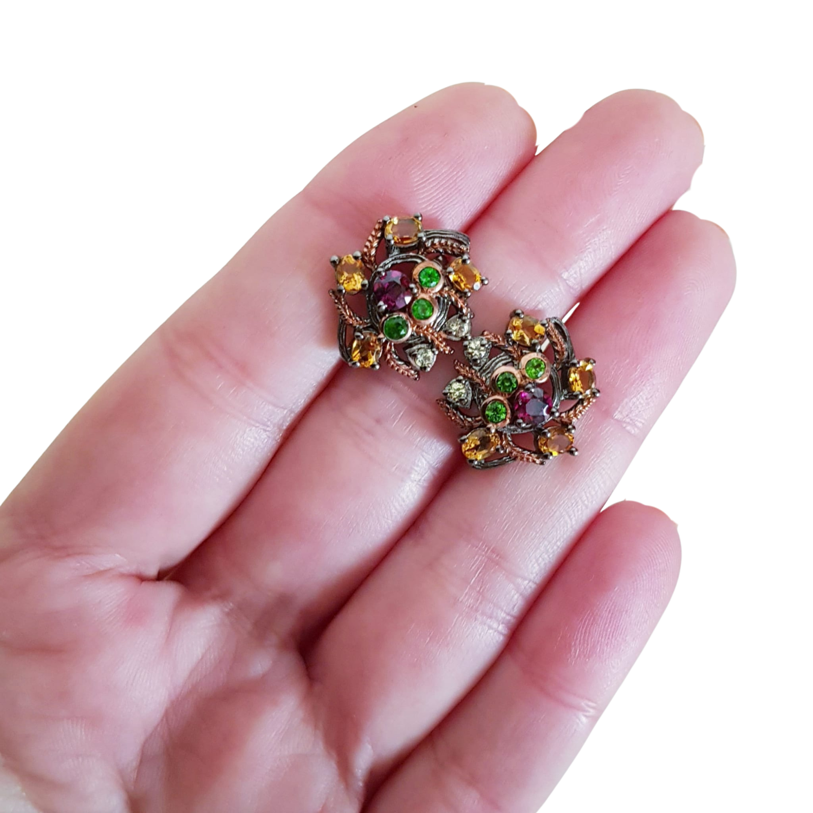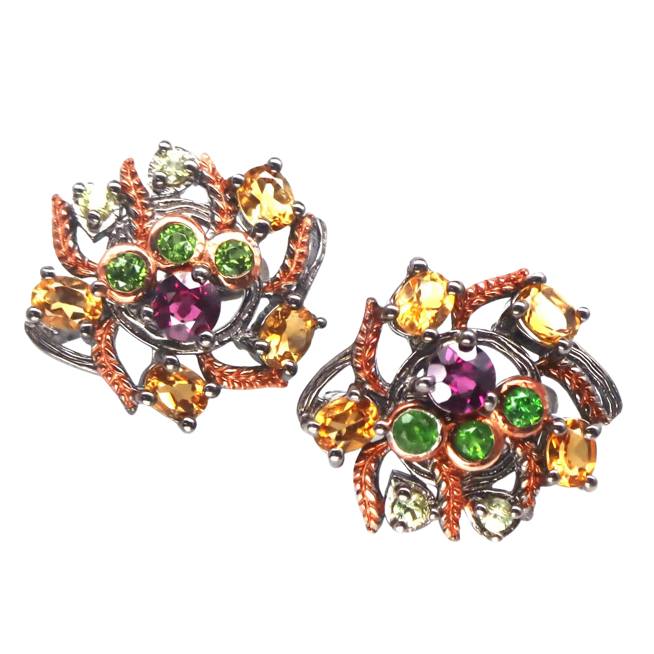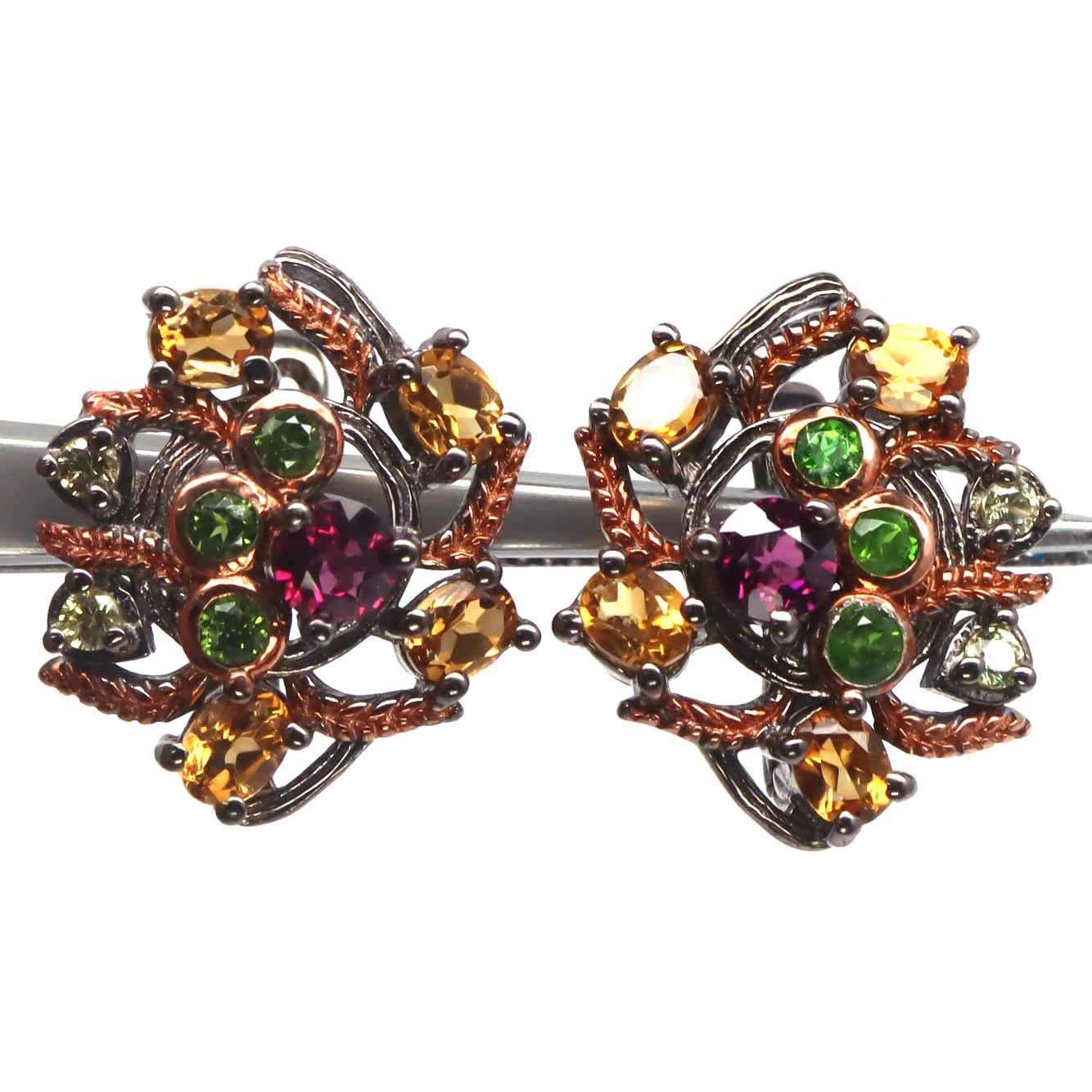 Bijuterii argint,: Cercei argint 925, rodiat negru (Rutheniu), cu o usoara tusa de aur roz de 14k cu pietre naturale: granat, citrin si crom-diopsid.