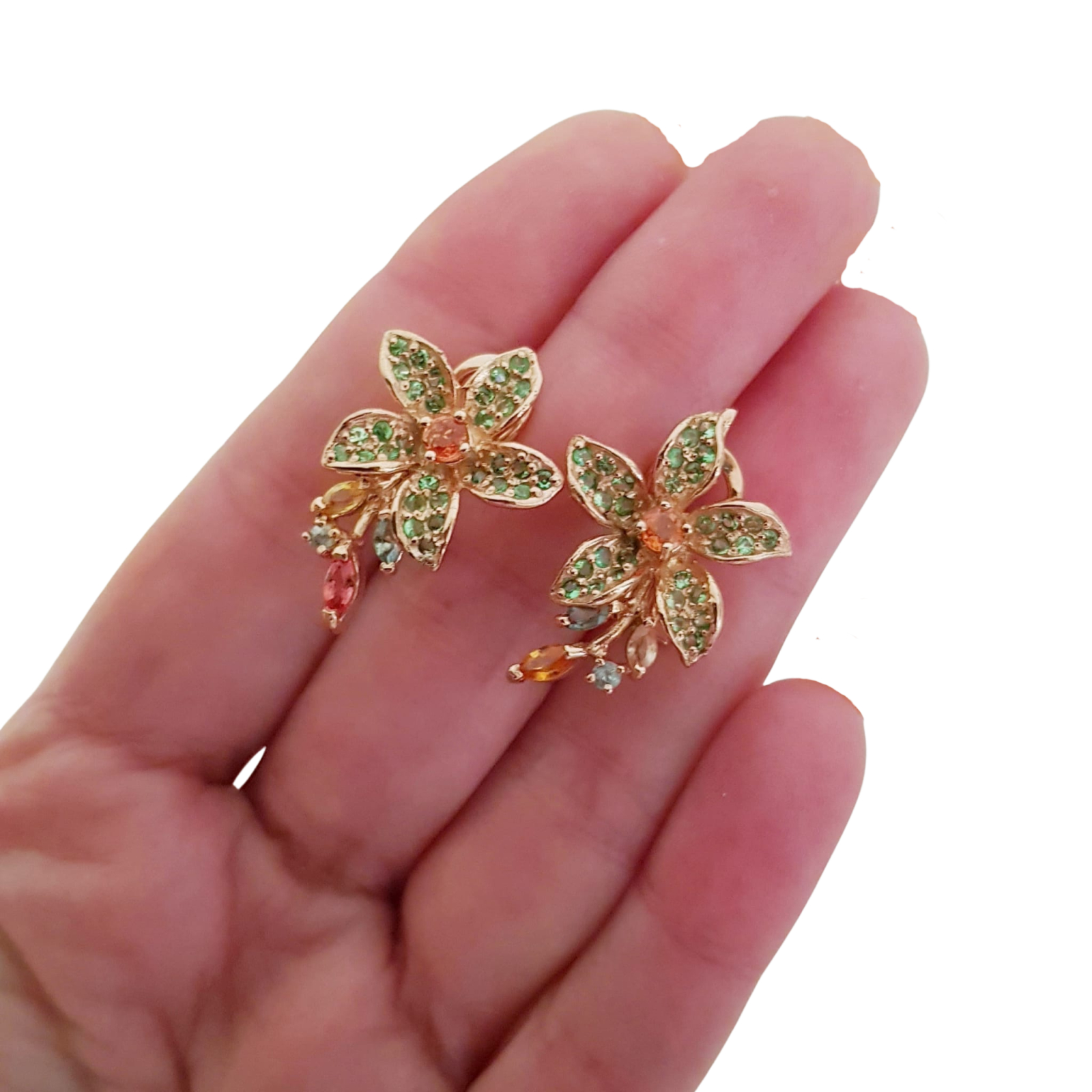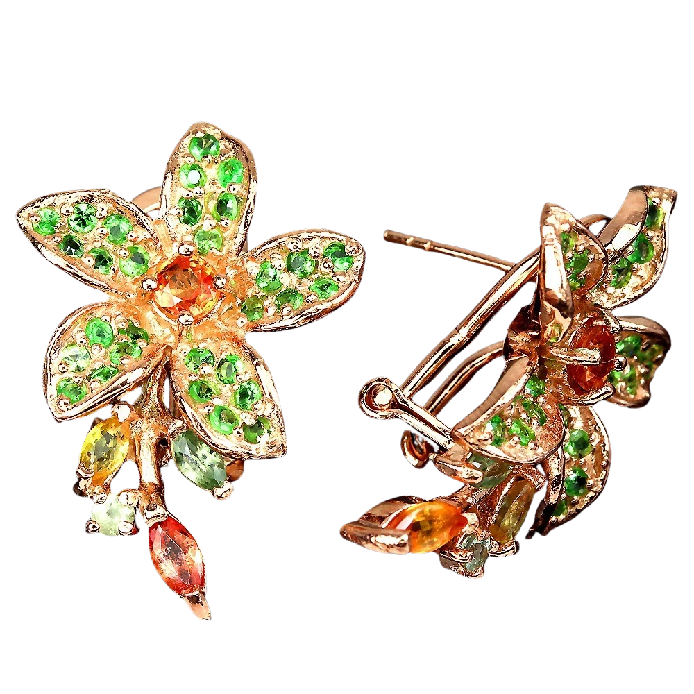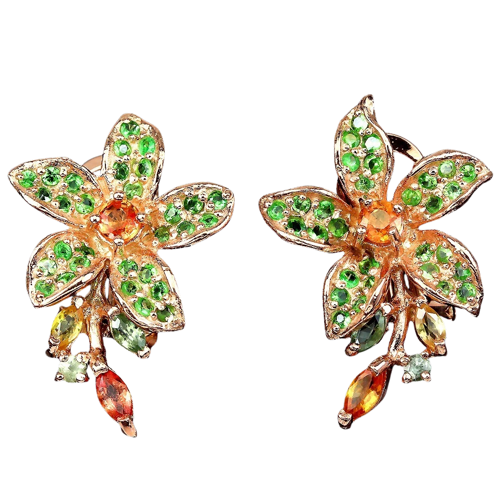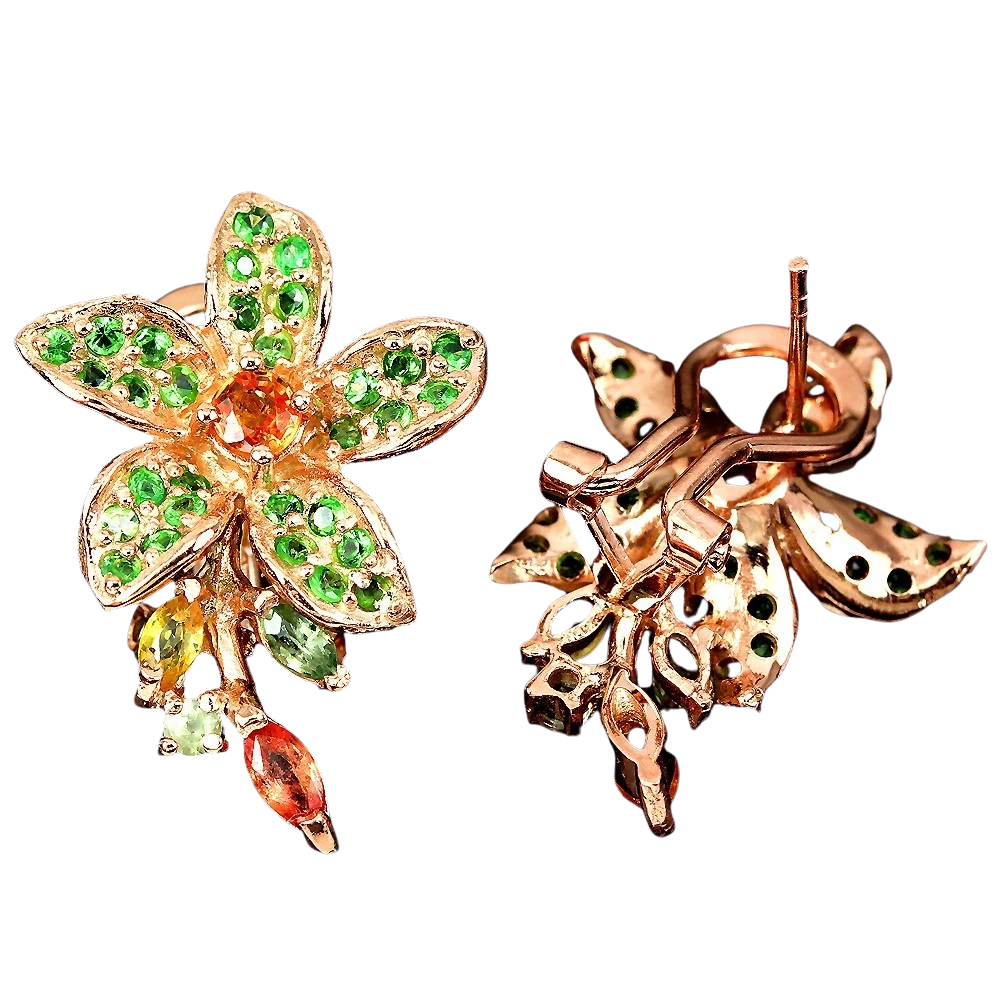 Bijuterii argint,: Cercei argint, 925, aurit cu aur roz de 14k, cu pietre naturale: tsavorit si safir multicolor (fancy).