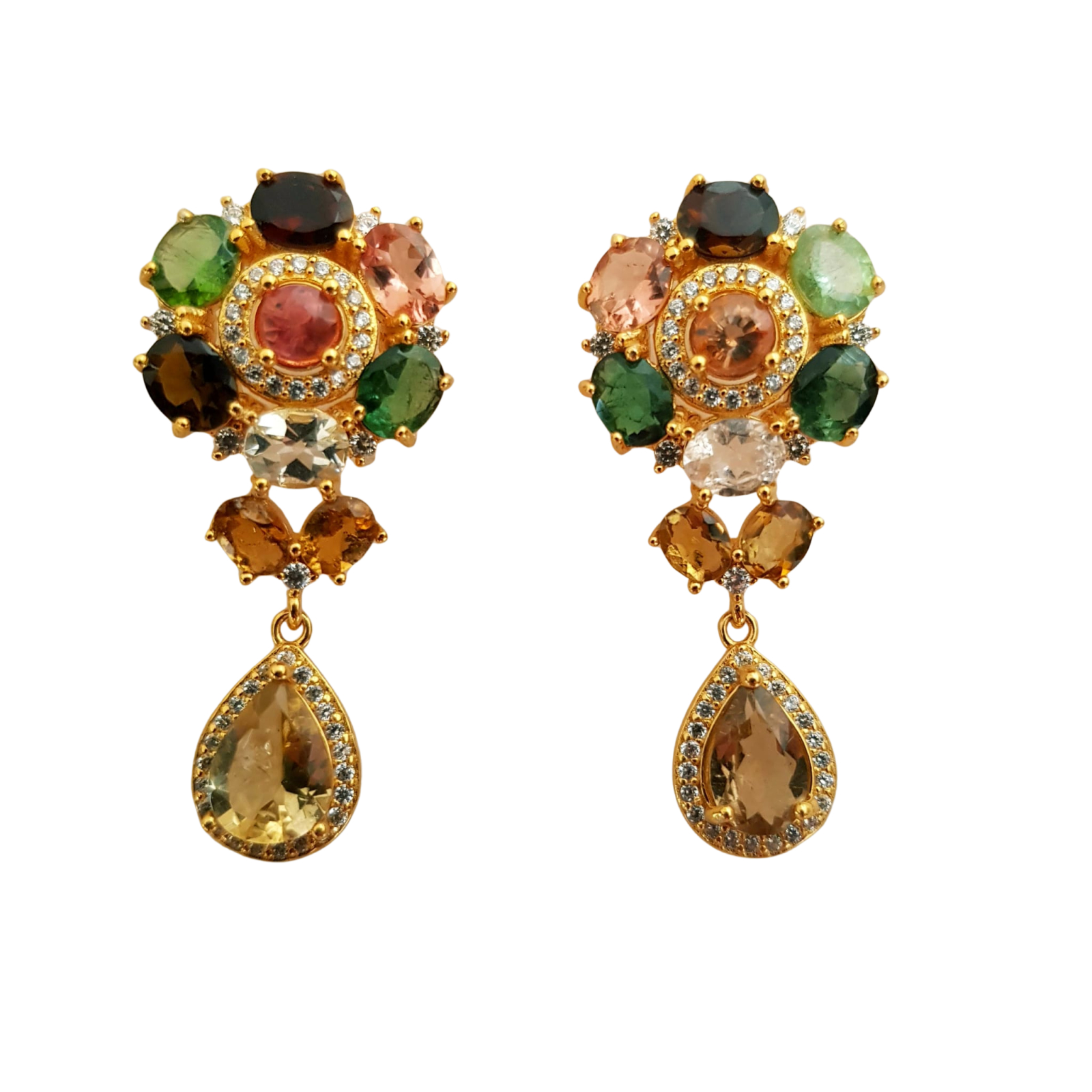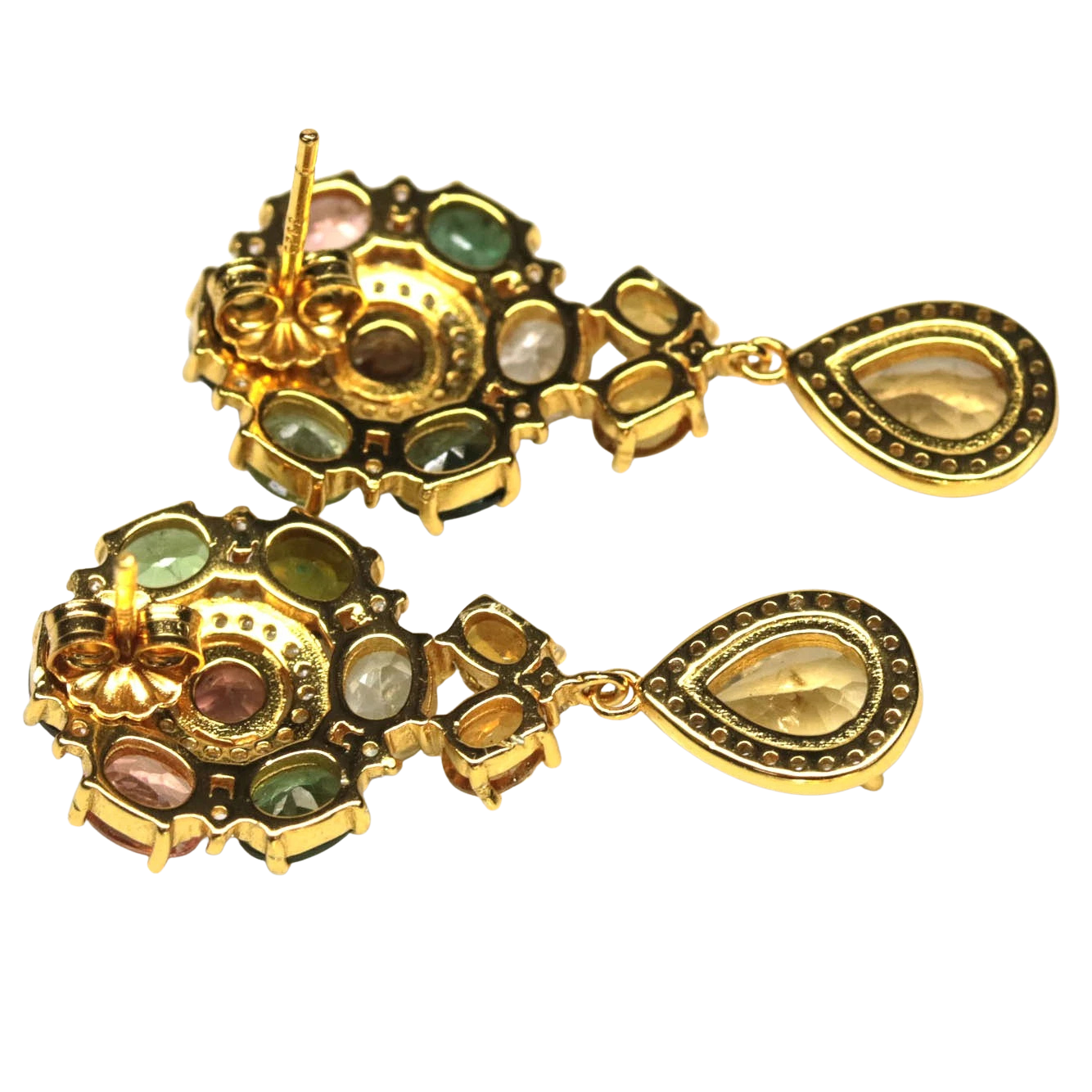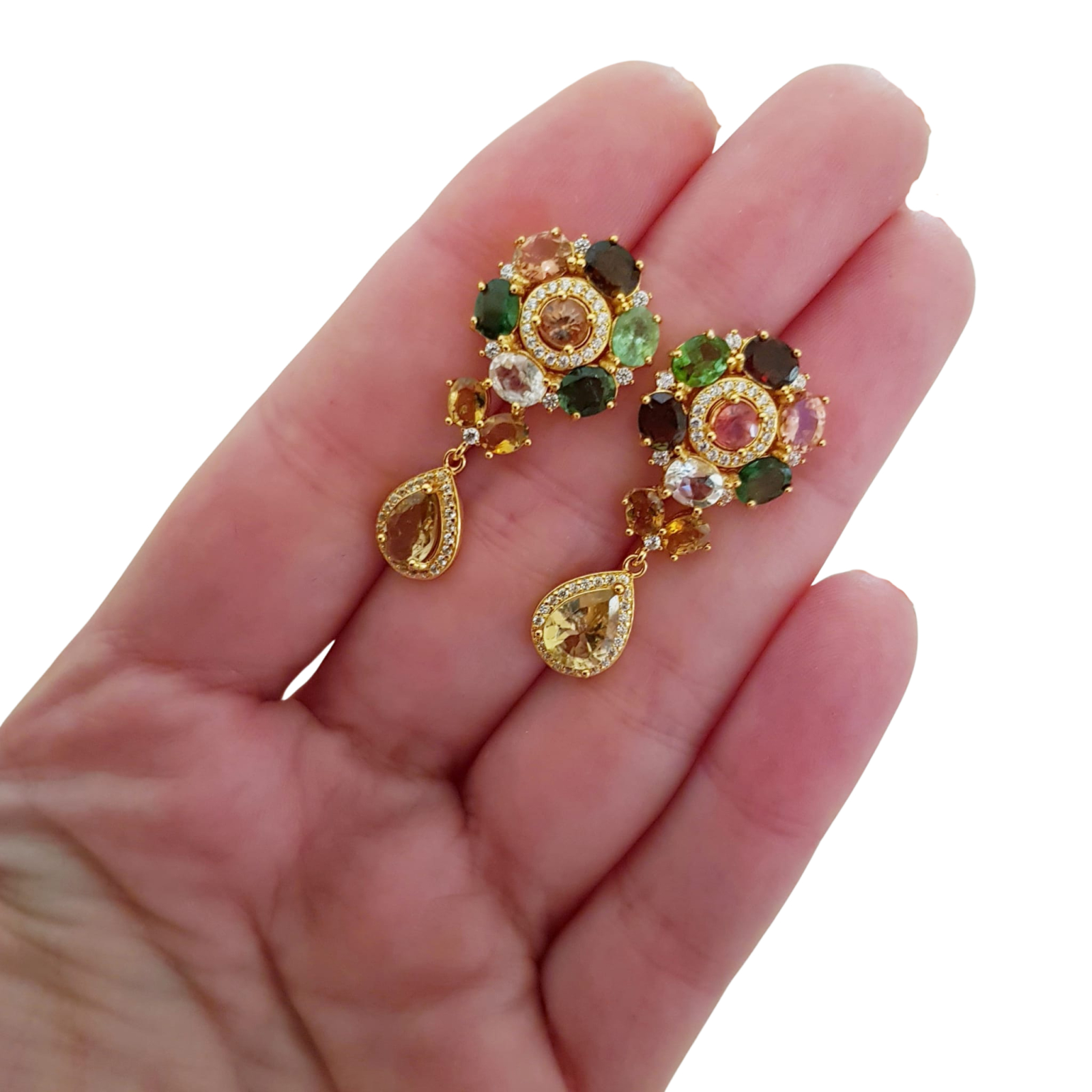Bijuterii argint,: Cercei argint, 925, aurit cu aur galben de 14k, cu pietre naturale: turmalina si citrin; cz. Unele pietre prezinta incluziuni naturale.